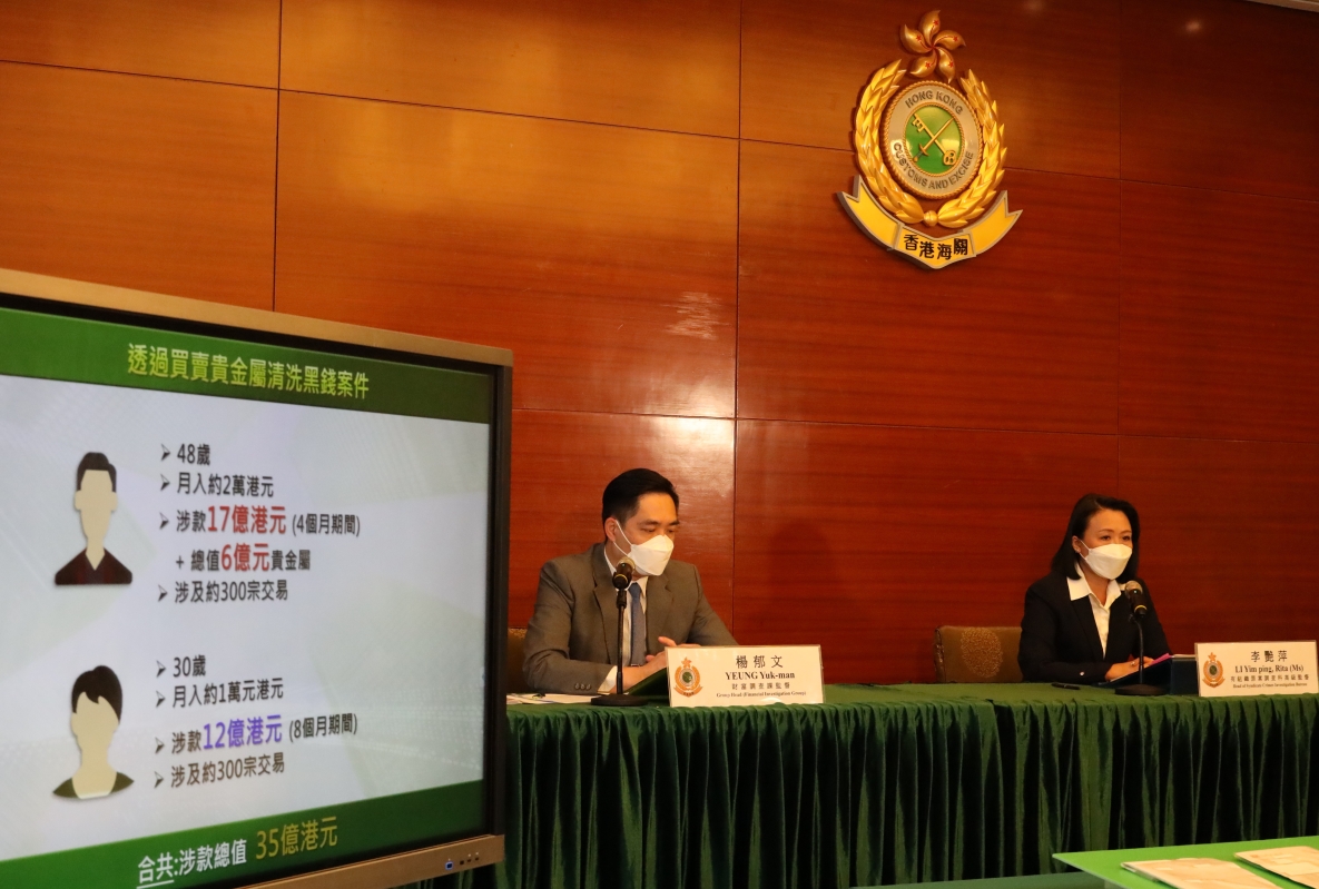 香港新聞網10月26日電(記者洪少葵)10月26日,香港海關有組織罪案調查科高級監督李艶萍、海關有組織罪案調查科財富調查課監督楊郁文和海關有組織罪案調查科財富調查第一組指揮官黃貞富在海關總部大樓舉行記者會,總結偵破35億元洗黑錢案的行動詳情。香港海關10月21日采取代號“煉金者”的執法行動,偵破一宗涉及變賣貴金屬的懷疑洗黑錢案件,涉款約35億元,並拘捕兩名30歲和48歲的本地男子,這是海關歷來破獲的洗黑錢案中涉款額最高的一宗。海關初步調查指,兩名被捕男子於2020年至2021年期間,以變賣不明來歷的貴金屬和利用公司銀行戶口處理共約35億元的懷疑犯罪得益。