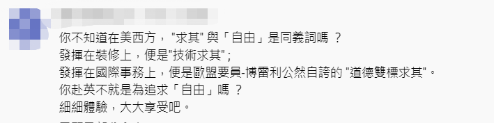 視頻截圖 令人意外的是,在影片中,被指為“黑醫護”之首、煽暴推手之一的馬仲儀仿若 “怨婦”上身,對移英生活的種種不便利大吐苦水。她抱怨英國裝修師傅的水平參差,一些基本的工作也做不好,如一道牆夠不夠直、會不會偏向一邊,“他們的量度、手工很隨便!” 她又“不滿”地說,英國裝修工人的分工很細,導致在香港一天可以做完的事情,在英國三天也未必能完成,對香港人來講真的很不習慣。 以家裡漏水一事為例,馬仲儀稱發現後立馬找了發展商處理,但發展商說,要先找電工來拆掉燈飾,再找水喉匠打通水管,最後找油漆師傅來修整天花板。可問題是,這三個工人不能在同一天來,具體什麼時候能找到相應工人也說不定。旁邊的王慧芬則補充,有朋友在英國也遇到類似情況,整整用了半年才修好。 他們還吐槽,英國人的“不靠譜”不僅體現在裝修方面……王慧芬直言在英國買樓時遇到很不專業的律師,前前後後把她的名字、地址、銀碼(交易價值)寫錯了10多次,還不以為意,“讓我感到非常害怕。”並且,英國律師常常不回覆消息。她自曝有朋友等律師的消息等了一年多,最後才驚覺有關律師樓已經結業! 被指在黑暴期間煽動學生違法的陳文敏,也承認英國人的辦事效率和港人天差地別。直言對於英國人來講,文件出錯是很正常的事情,在香港10分鐘做完的事情,在英國可能一個月才能做完。如果遇到即將下班的情況,香港上班族仍會堅持完成工作,英國職員則會“輕飄飄”扔下一句——“我已經下班了,放假回來再說吧。” “(英國人的工作態度)和香港人的拼搏精神好不一樣。”陳文敏無奈地說。 然而人已經移英了,再吃後悔藥也來不及了!三人其後只好為眼中的“自由天堂”找補,甚至不忘踩故土一腳…… 剛指責完英國裝修工人低效、不專業,馬仲儀轉眼就辯稱這是因為英國工人“分工細緻”,不像香港一樣“全部包辦”,導致就業機會減少;陳文敏、王慧芬也將英國職員的低效美化為追求“工作與生活平衡”,稱“人生這樣才豐富”…… 在這些亂港搞手眼裡,英國人“低效、不拼搏”值得肯定,香港人兢兢業業反被挑剔。言語中透露著對移英生活的不適應,還要強行為自己離港赴英的決定挽尊…… 因此,不少香港網友看後紛紛忍不住開啟嘲諷模式! 有網友聯想到曾被這些人煽動參與黑暴的“手足”,笑言“手足”可以幫手“裝修”他們在英國的家! 也有網友揶揄美西方一向“隨便”:“發揮在裝修上,就是‘技術隨便’;發揮在國際事務上,就是‘道德雙標隨便’!”質疑馬仲儀等人赴英不就是為了追求所謂的“自由”嗎,那就“細細體驗,大大享受吧”。
