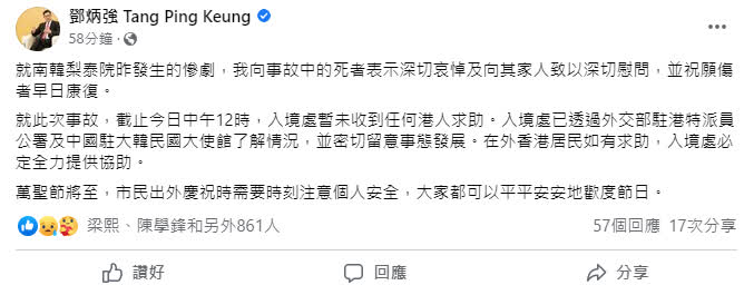 鄧炳強向事故中的死者表示深切哀悼及向其家人致以深切慰問,並祝願傷者早日康復。FB截圖 鄧炳強表示,就此次事故,截止10月30日中午12時,入境處暫未收到任何港人求助。 他強調,入境處已透過外交部駐港特派員公署及中國駐韓國大使館了解情況,並密切留意事態發展。在外香港居民如有求助,入境處必定全力提供協助。 【編輯:许丰悦】