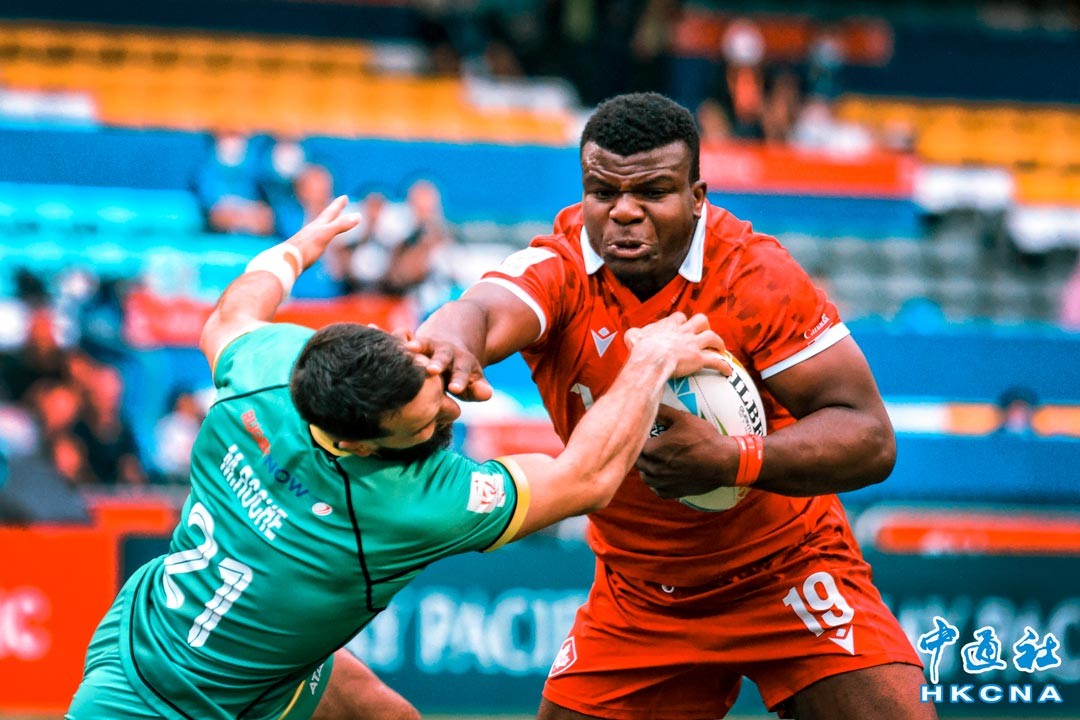 11月5日,香港國際七人欖球賽舉行第二個比賽日,16支國際級強隊在小組賽中爭奪晉級8強的席位。圖為愛爾蘭隊(綠)對戰加拿大隊(紅)。(香港中通社記者 許其皓攝)