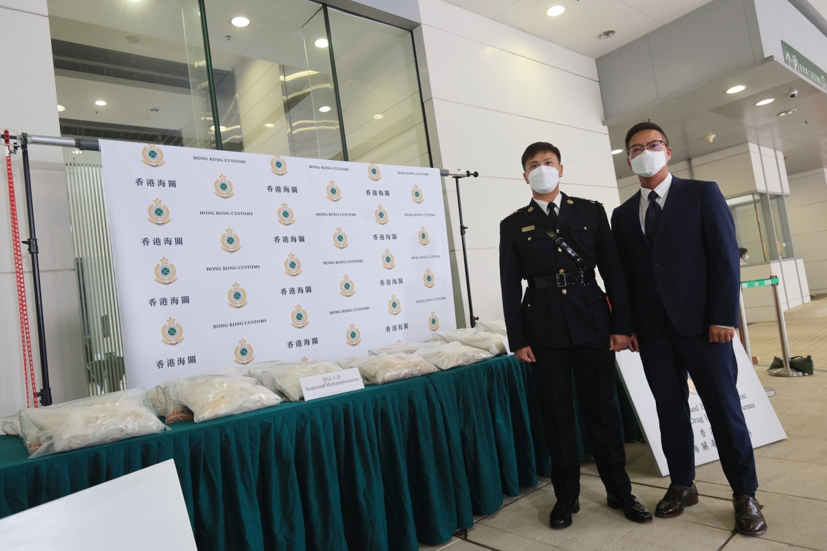 海關毒品調查科機場調查組指揮官林澤麟(右)和署理海關機場科空運貨物高級督察何俊輝(左)出席記者會