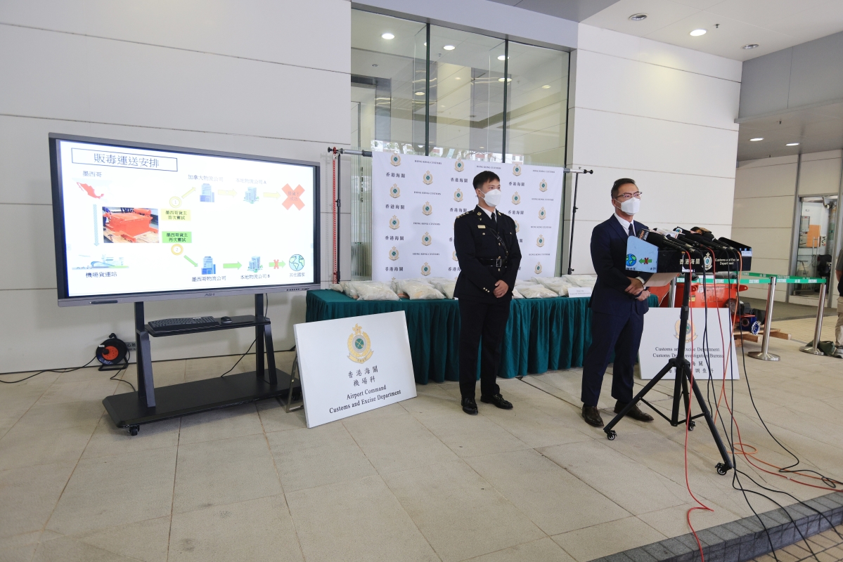 海關毒品調查科機場調查組指揮官林澤麟(右)和署理海關機場科空運貨物高級督察何俊輝(左)簡介案情