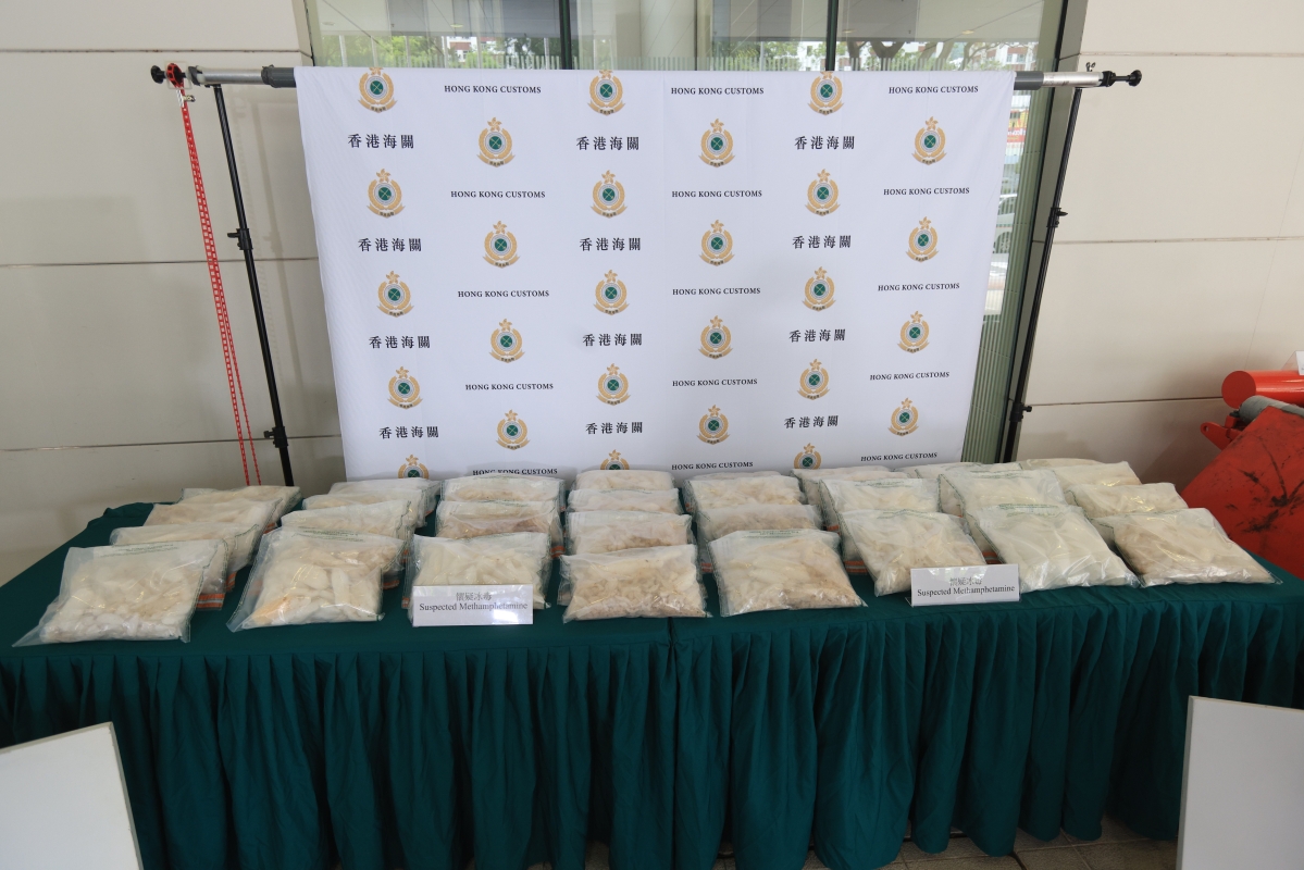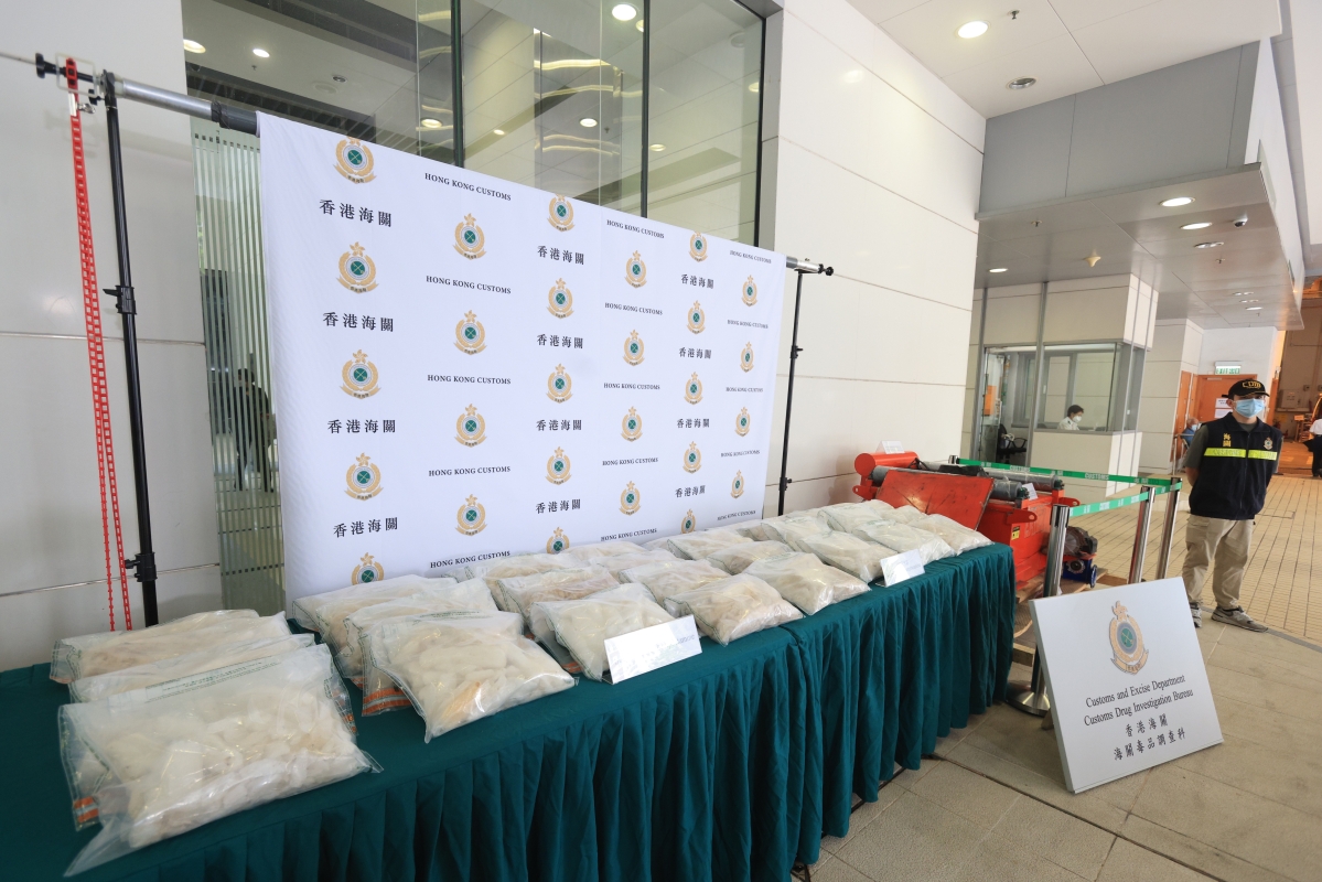 香港新聞網11月14日電(記者 許其皓)11月14日,香港海關在北角海關總部大樓舉行記者會,總結一宗冰毒案件詳情,海關毒品調查科機場調查組指揮官林澤麟和署理海關機場科空運貨物高級督察何俊輝出席記者會。10月24日海關在香港國際機場偵破一宗大型販運冰毒案件,於一個懸掛式電磁除鐵器內檢獲約100公斤懷疑冰毒,估計市值約6000萬元。