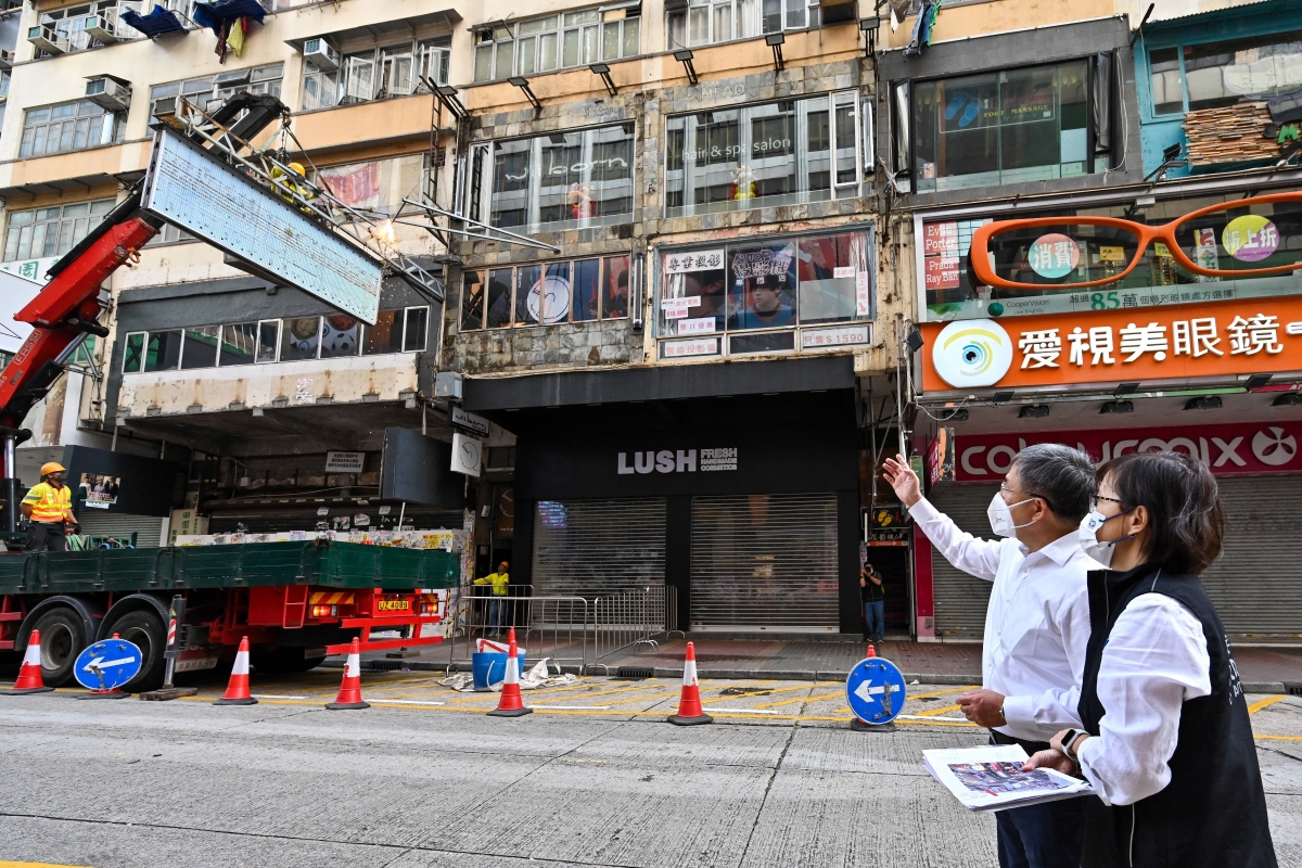 香港新聞網11月15日電 香港特區政府政務司副司長卓永興15日早上由屋宇署署長余寶美陪同到旺角視察清拆招牌行動,了解屋宇署處理危險及棄置招牌的工作。 屋宇署早前跟進市民舉報,向西洋菜南街一大廈外牆的四個棄置招牌的擁有人發出“拆除危險構築物通知”(“拆除通知”),要求他們拆除該些招牌。由於招牌擁有人逾期沒有遵辦有關“拆除通知”,屋宇署當天拆除有關招牌。清拆行動於早上八時三十分進行,以盡量避免阻礙交通或對附近商鋪及行人引起不便。 除處理市民舉報外,屋宇署近年加強針對危險及棄置招牌的執法工作,揀選人流多及交通流量大的區域,進行定期巡視招牌行動,集中處理區內的危險及棄置招牌,以保障公眾安全。