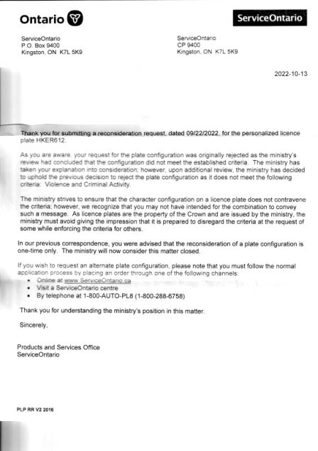 港人Tom在網上看見有人申請了HKER的自定車牌(圖片來源:網絡) 據悉,港人Tom移民加拿大後考到G2車牌,買車後準備申請自定車牌。他在網上看見有人申請自定車牌HKER後,也照葫蘆畫瓢地向當地服務中心申請車牌HKER612,欲“低調及隱晦地紀念或提醒自己香港2019年發生的事”。 不過,Tom的“如意算盤”沒打響!9月初,他收到拒批的信件,內容指有關自定車牌違反了“暴力及刑事活動”(Violence and criminal activity)的標準。 被加拿大政府“打臉”後,Tom一度不服提出上訢,並要求服務中心給出例子或參考資料。10月中旬,對方作最後回信,表示他的上訴不被接受,亦沒有再作解釋,僅讓他選擇其他號碼。