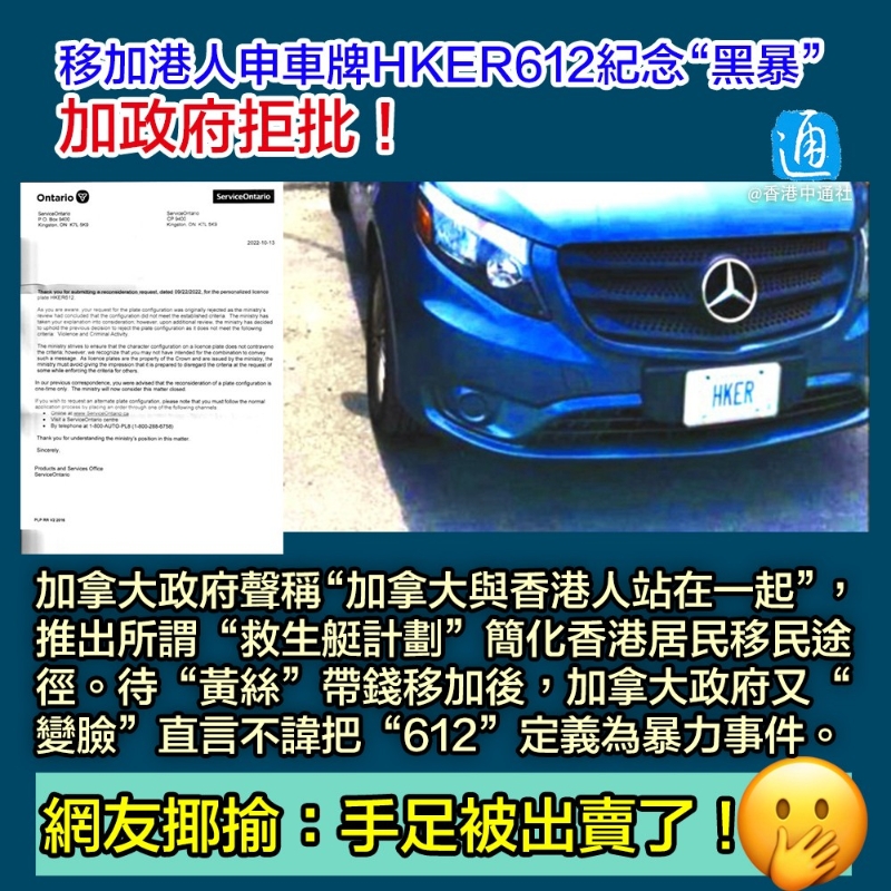 香港新聞網11月15日電 “黃絲”移民海外不忘惦記香港? 近日有消息稱,一名移居加拿大的“黃絲”港人為紀念“黑暴”事件,申請自定車牌HKER612,豈料被加拿大政府拒批,理由是——涉暴力刑事活動。 憶起早前加拿大政府還聲稱“和香港人站在一起”,有網友獲悉後忍不住嘲諷,“手足”被出賣了!