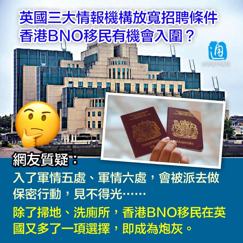 香港新聞網11月18日電 英國三大情報機構放寬招聘條件,香港BNO移民有機會入圍? 英國《衛報》早前引述政府通訊總部、軍情五處(MI5)和軍情六處(MI6)的發言人稱,英國這三大情報機構為擴大招聘賢材範圍,不再將父母其中一人是英國公民或來自特定獲批國家視為招募條件,換言之父母並非英國公民者,也可獲得聘任資格。