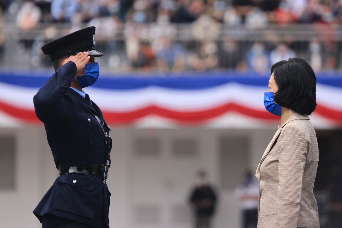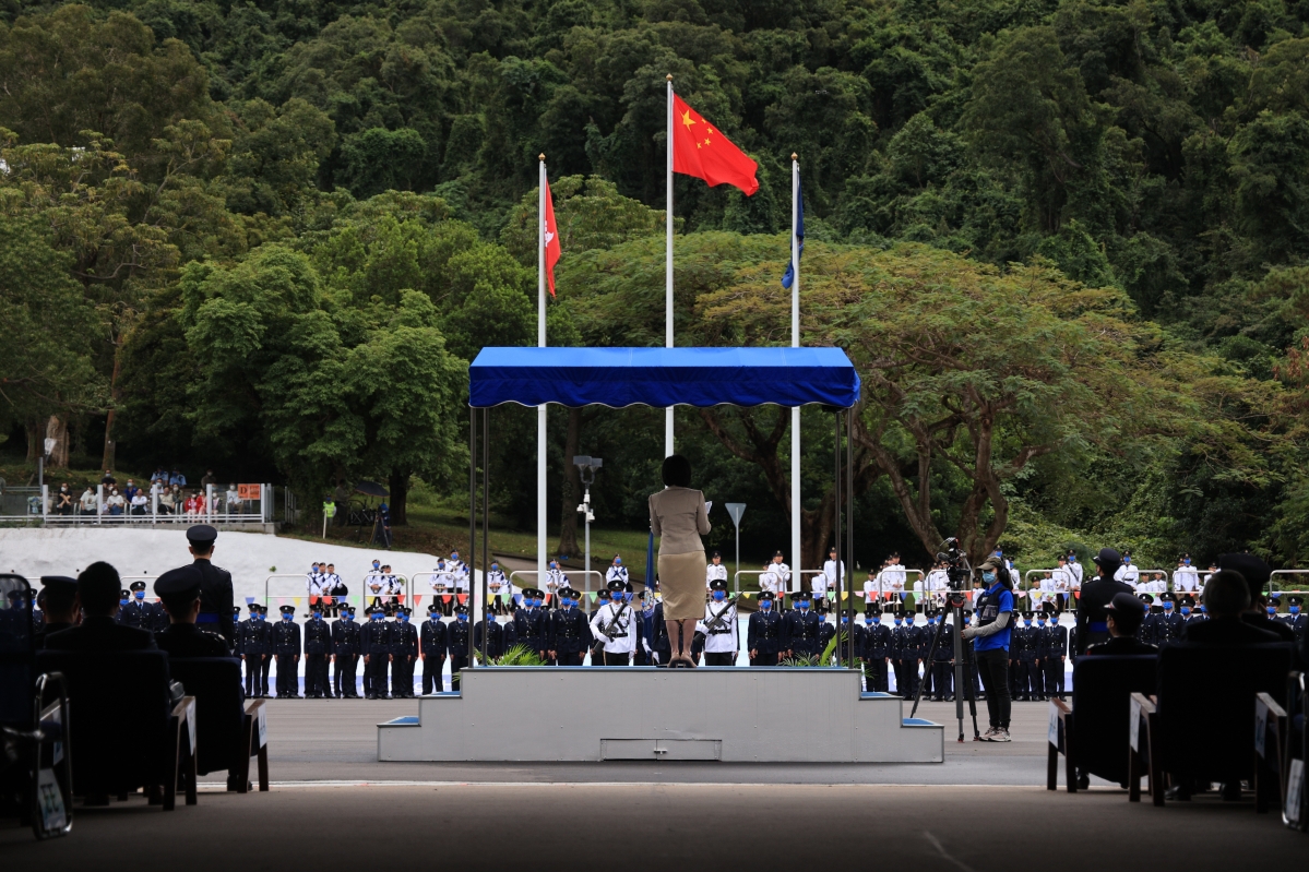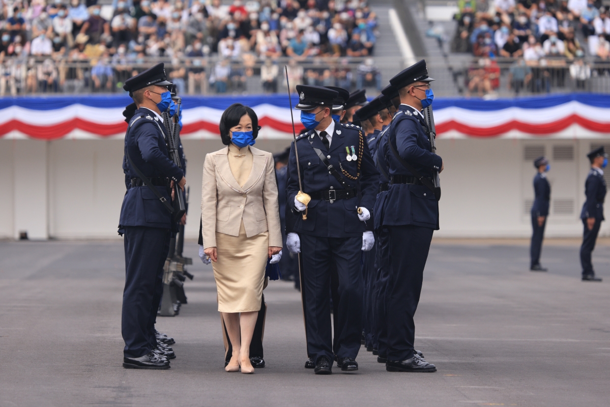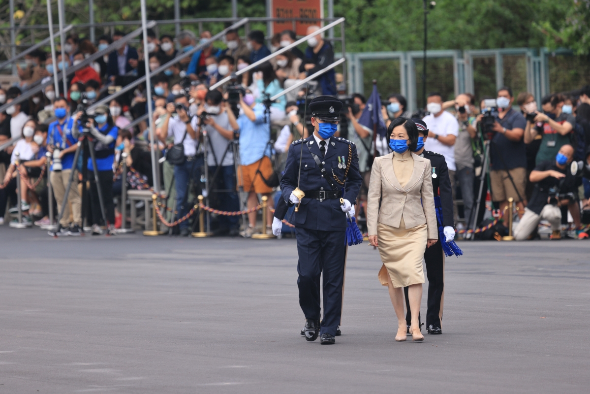 香港行政會議非官守議員召集人葉劉淑儀(右)擔任檢閲官。葉劉淑儀致辭時说,反修例風波期間的違法暴力事件,令人膽顫心驚,警隊站在維護法治及市民安全的最前線,展示出迎難而上、不怕難關的精神和勇氣。 這場風波亦證明社會要時刻居安思危,未雨綢繆,准備好各種風險和挑戰。