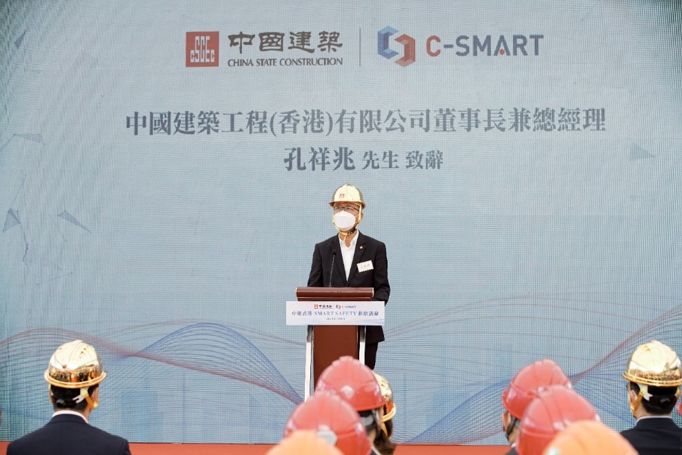 中建香港助理總經理邵瑞喆(台上右二)介紹“C-SMART智慧工地管理平台” 為打造智慧工地及安全管理文化,並響應政府共建工地安全文化的目標,活動上介紹了中建香港自2020年起自主研發的“C-SMART 智慧工地管理平台”,並透過宣傳短片分享平台如何在安全、質量、人員及機械設備等範疇上全面提升工地安全管理,更有效地預防工業意外。同時,為配合集團實踐國家“十四五”新征程,中建香港特意引進“科技 +”為核心戰略之一,並透過創新科技加快公司轉型升級,引領建築工業化潮流。