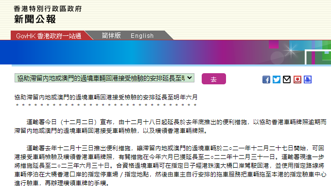 香港新聞網12月2日電 香港運輸署今日(2日)宣布,由12月18日起延長於去年底推出的便利措施,以協助香港車輛牌照逾期而滯留內地或澳門的過境車輛回港接受車輛檢驗,以及續領香港車輛牌照。