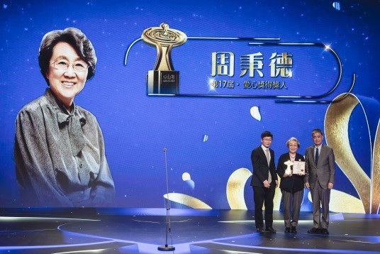 一丹獎基金會秘書長馬逸靈為陳一丹代領獎 中新社原副社長、北京大鸞翔宇慈善基金會創始會長周秉德成為愛心獎的第100位得獎人,身為周恩來總理的侄女,她的心願就是秉承周總理“懷慈善之恒心,獻福祉於民眾”的使命,助學濟困,如鸞鳥般將大愛播撒人間。