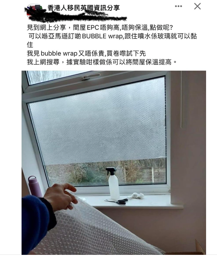 香港新聞網12月15日電 英國迎來逾十年來最冷冬季,但在通脹和能源危機影響下,超300萬家庭卻無力負擔供暖費用。大批沒體驗過漫漫寒冬的移英港人亦不裝了、紛紛於社交網站抱怨英國寒冷難捱。為了取暖,他們可謂絞盡腦汁。 有移英港人近日在Facebook群組“香港人移民英國資訊分享”中發帖,表示住所EPC(能源性能證書)評級低,住所保暖效果不夠好,如何才能讓室內沒那麼冷呢?其後,他支招稱在玻璃窗上噴水,再貼上一層網購來的泡泡紙即可。 發帖者大讚保暖效果顯著,“真的是(變)溫暖了,之前你會感到冷空氣從玻璃不斷滲進來,現在就不會了,效果非常好。”