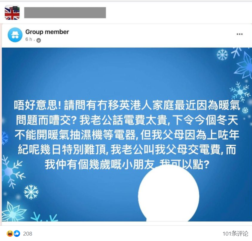 社交媒體截圖 英國寒冬難熬,加上電費高漲,群組內的其他移英港人亦紛紛在評論區分享各自的“禦寒大法”,有港人表示會在門縫塞入防撞棉,也有人曬圖稱可點蠟燭取暖。不過,英國受寒流侵襲,蘇格蘭氣溫低至零下15攝氏度,天寒地凍之下,只靠貼泡泡紙、點蠟燭等方法取暖相信幫助甚微。 一名移英人妻更在網上控訴說,老公嫌電費太貴,下令這個冬天不能開暖氣和抽濕機等電器。“但我父母因為上了年紀,這幾日特別難頂,”該移英人妻無奈地說,家中還有個僅幾歲的小朋友,現在不知道如何才能安穩過冬。