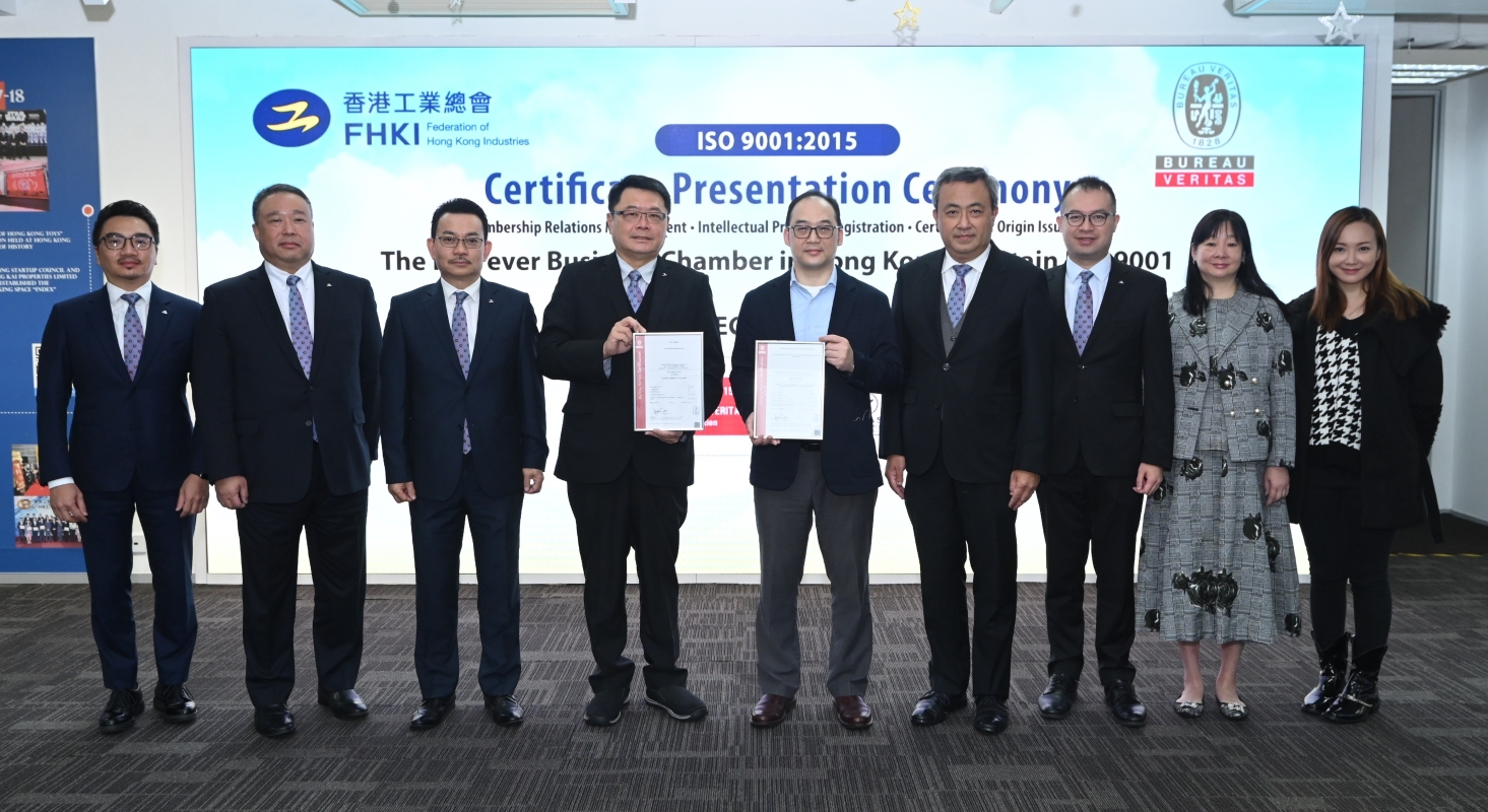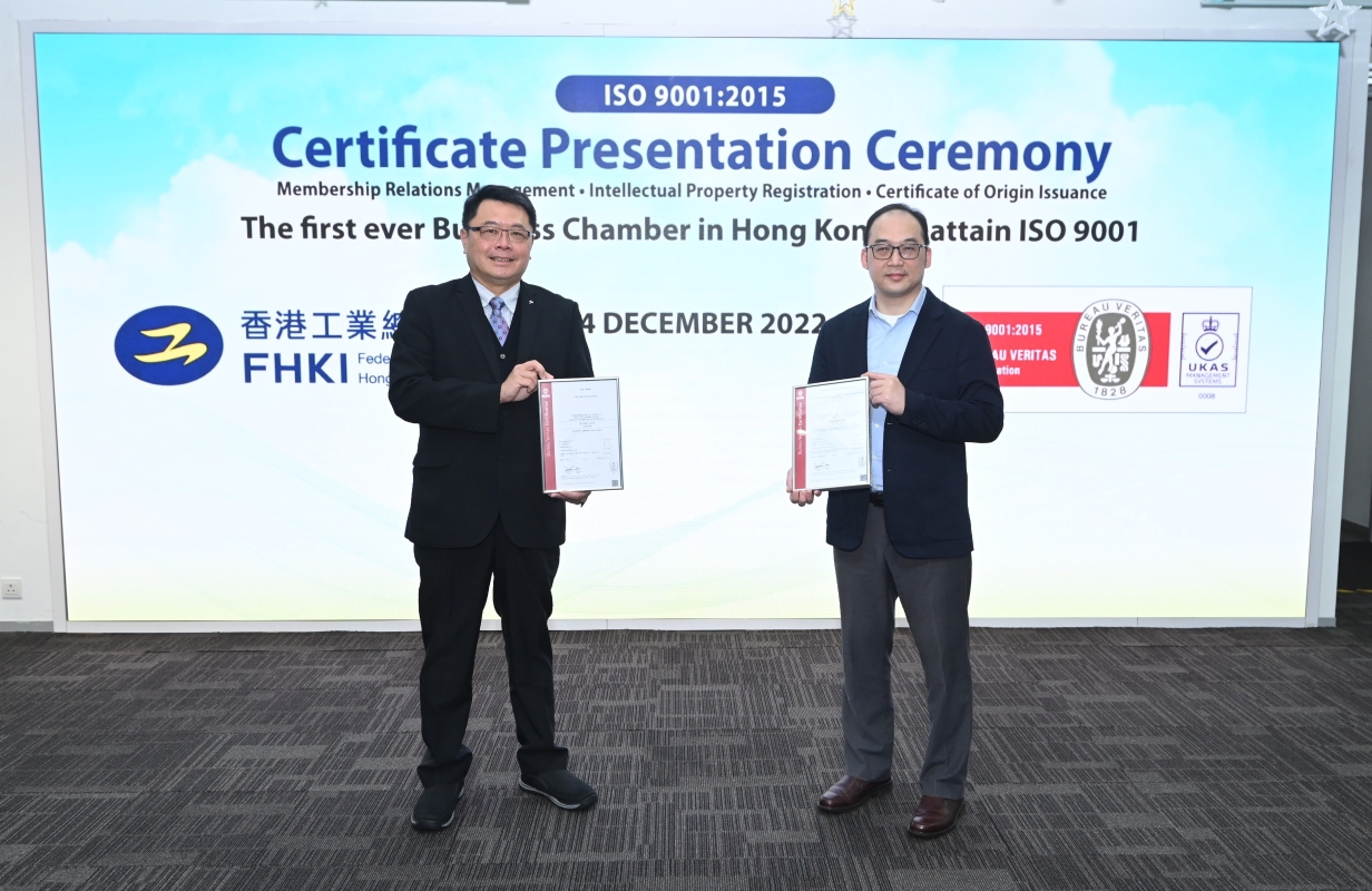 香港新聞網12月15日電 香港工業總會15日獲頒發 ISO 9001:2015 品質管理體系認證,成為全港首個獲得 ISO 9001的商會,突顯工總卓越的管理水平以及持續提高整體績效的決心。ISO 9001:2015是國際標準化組織於2015年發佈的質量管理標準,確保組織朝向戰略發展目標,有系統地策劃工作,為客戶提供優質產品或服務。工總這次成功獲取認證,經過獨立機構必維認證集團認證控股有限公司英國分公司審核,覆蓋範圍包括工總會員關係管理、知識產權登記及產地來源證簽發。
