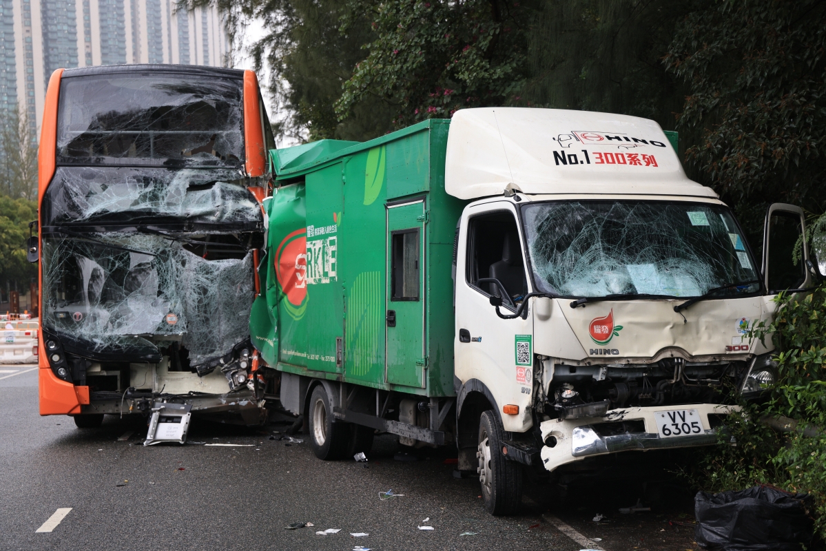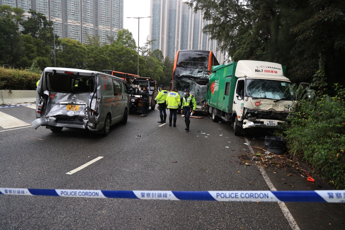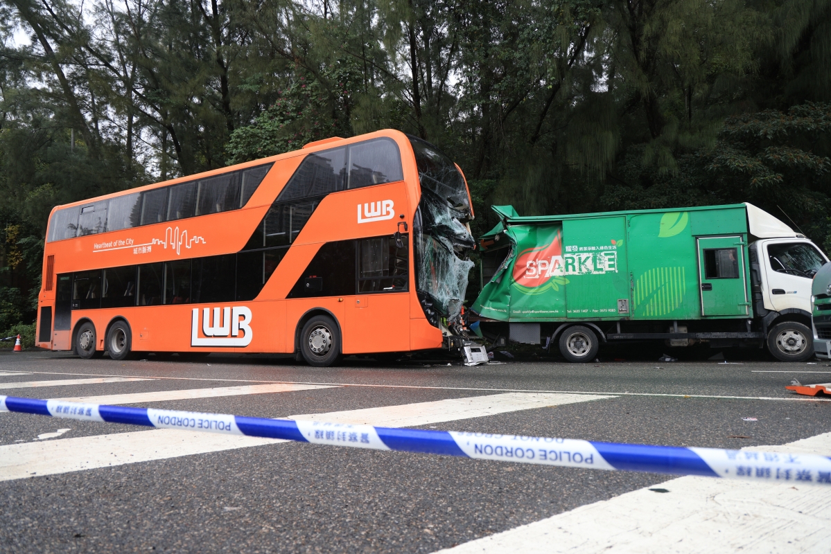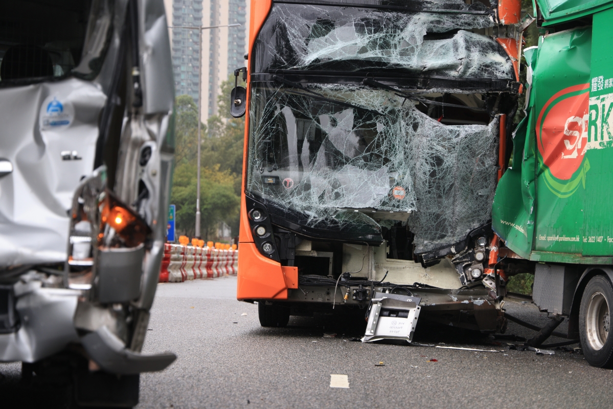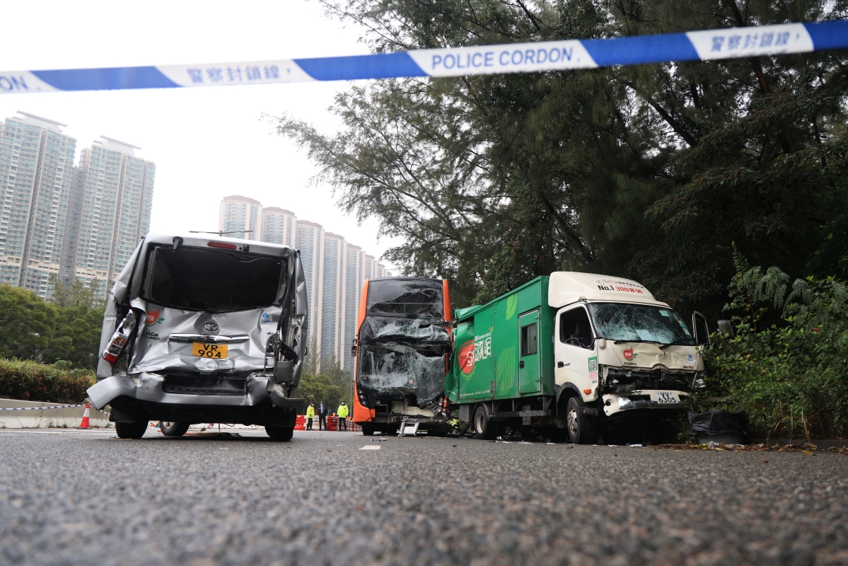 香港新聞網12月16日電(記者 許其皓)12月16日早9時許,香港東涌裕東路近東交匯處,一輛龍運巴士、一輛5.5噸貨車及一輛輕型貨車相撞,造成致命交通意外,有人一度被困於車底,貨車司机當場不治。現場可見,巴士車頭損毀嚴重,擋風玻璃嚴重碎裂,輕型貨車車尾被撞至凹陷,5.5噸貨車車頭玻璃破裂、車尾嚴重凹陷。警方和消防及時趕往現場救援和調查,此次事故至少造成1死12傷。