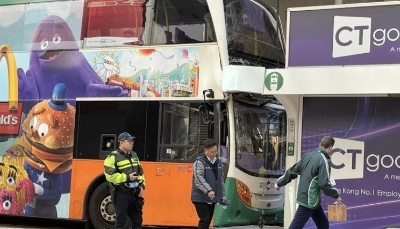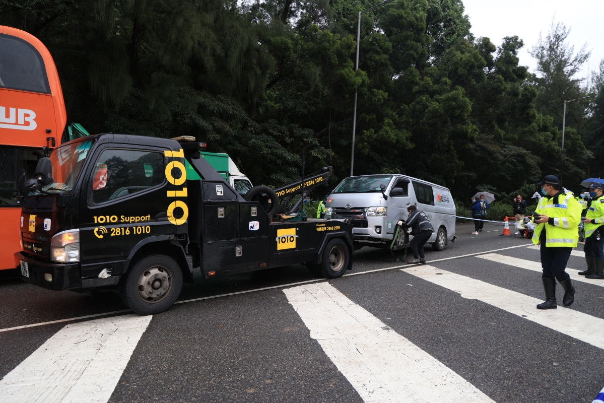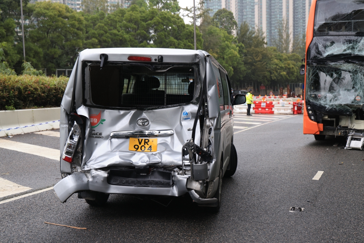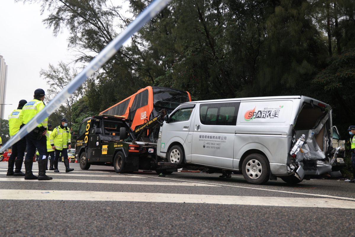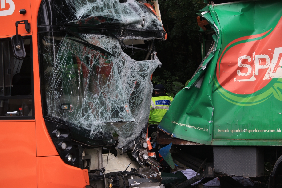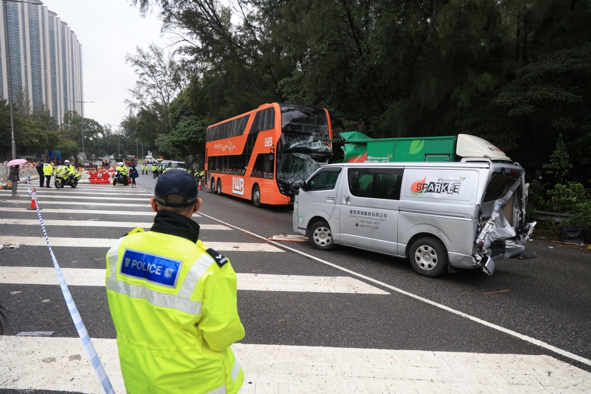 香港新聞網12月16日電(記者 許其皓)12月16日早9時許,香港東涌裕東路近東交匯處,一輛龍運巴士、一輛5.5噸貨車及一輛輕型貨車相撞,造成致命交通意外,有人一度被困於車底,貨車司机當場不治。現場可見,巴士車頭損毀嚴重,擋風玻璃嚴重碎裂,輕型貨車車尾被撞至凹陷,5.5噸貨車車頭玻璃破裂、車尾嚴重凹陷。警方和消防及時趕往現場救援和調查,此次事故至少造成1死12傷。