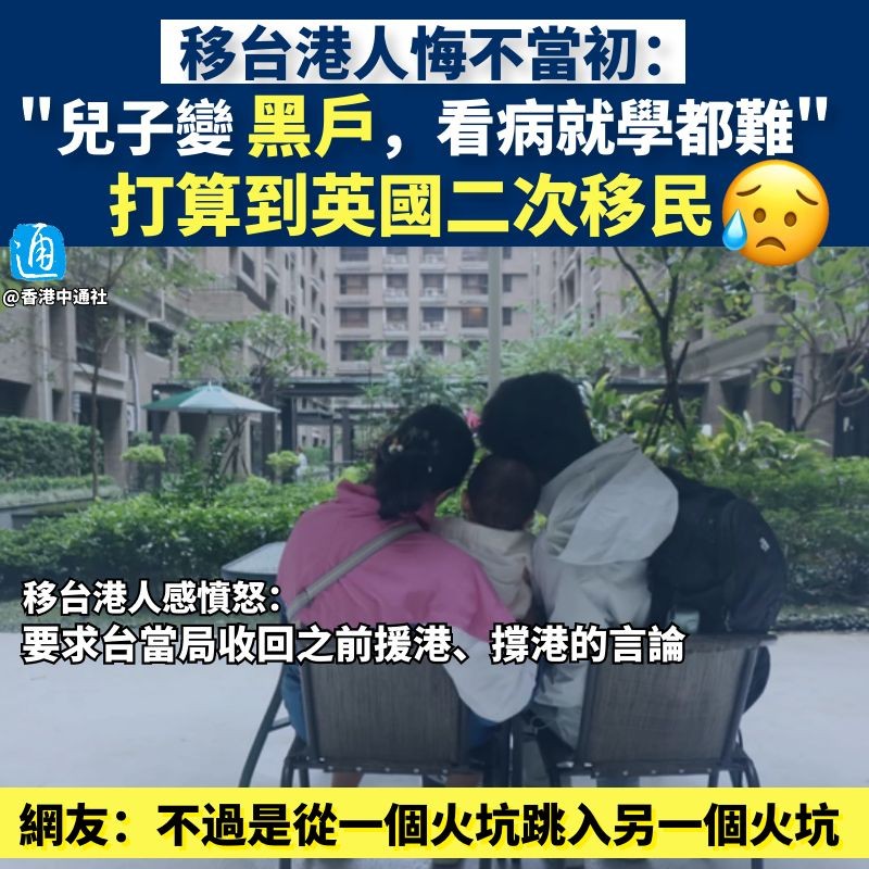 香港中通社製圖 CoCo透露,去年6月他們的兒子在台灣出生,沒想到其身份問題成為一大難題。根據台灣政策,他們需要帶初生兒子回港辦理身份證明文件及護照,再來台辦理居留證,否則兒子便是無身份的“黑戶”。 但夫婦不放心帶著剛出生的兒子搭飛機,加上去年港台疫情嚴峻,隔離程序嚴格,“移民監”期間又限制他們只能離開台灣30日。這種情況之下,他們無奈決定不返港,兒子也一直無法辦理戶籍。 沒有戶籍,在台就醫和上學均困難重重。CoCo難掩憤怒地說:“我的兒子在台灣一點人權沒有,這讓我對台當局好失望。”透露今年6月,兒子從沙發上摔下來,哭了一整晚,但因為“黑戶”問題,沒辦法在網上掛號,先後赴兩間醫院及一間診所求診,奔走兩日,最終因醫院職員不忍心,才求得於成人骨科就醫。兒子證實是骨裂,慶幸並無大礙。 於就醫方面驚險跨過一關後,就學又成了港人夫婦的頭等痛事! 兒子至明年8月便滿兩歲,就學問題迫在眉捷。若屆時兒子取得居留證,亦只能報讀昂貴的私立學校。CoCo抱怨,私立學校學費“貴到天價”,加上他們夫婦已經失業一年,形容情況等同直接趕他們走! Peter也表示移台後找工作非常艱難。他原本在一間國際快遞公司從事客戶服務工作,來台前,香港分公司介紹他到台灣分工司任職,可台灣分公司卻嫌申請工作證麻煩,拒絕給予他工作。 為了謀生,Peter還報考了職業司機牌照,可他通過駕照考試後,才被告知無法取得職業駕駛牌照,須待他取得台籍後才能發照。 更糟心的是,好不容易捱過一年的“移民監”,他們今年3月向台當局提出定居申請,卻數度被要求補件,直至9月接獲判決書,被要求於2023年8月再補交“在台營生計劃”。這相當於宣判他們定居失敗,要再加一年“移民監”。 面對這樣的結果,Peter憤怒地說,“要求台當局收回之前援港、撐港的言論”,並勸誡港人看清台當局真面目,再做移居規劃。 對台灣徹底失望後,這對港人夫妻現下又打起移居英國的主意。不過,有了移台的慘痛教訓,該對港人夫婦顯然對移英後能否安定下來頗感迷茫。面對鏡頭,只能強打“強心針”,稱為了所謂“自由的環境”,未來“再惡劣都會撐下去”,“必須承受所有的困難”。 這對移台港人夫妻的遭遇,亦引發網友熱議。 “千萬不要相信台灣政治人物!”有網友呼籲港人不要輕信政客言論,“香港‘手足’竟然會相信一個把自己最有競爭力的企業送給外人、把自己人民推上戰場當炮灰的政黨,真是一人做錯,全家受累!” 有網友感歎,一些香港人本可以擁有幸福的生活,但盲目跟風,導致今日被“當成皮球一樣,被人踢來踢去”。 也有網友想到英國近日罕見的低溫和通脹,認為二次移民到英國並非好選擇,“不過是從一個火坑跳入另一個火坑!” 【編輯:李冉】