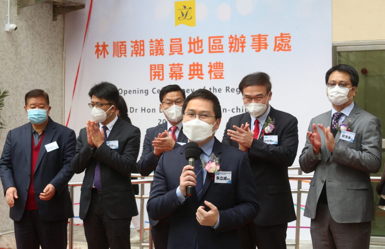 候任全國人大代表、香港島各界聯合會常務副理事長兼秘書長朱立威在開幕儀式上致辭 候任全國人大代表、香港島各界聯合會常務副理事長兼秘書長、南區地委會主席朱立威也在開幕儀式上致辭;他表示,林順潮在全國人大和立法會兩個平臺都為國家和香港的醫療發展獻言獻策,推動兩地醫療融合,投身大灣區建設。林順潮在利東邨開設辦事處會積極推動南區和港島區民政事務發展,可喜可賀。