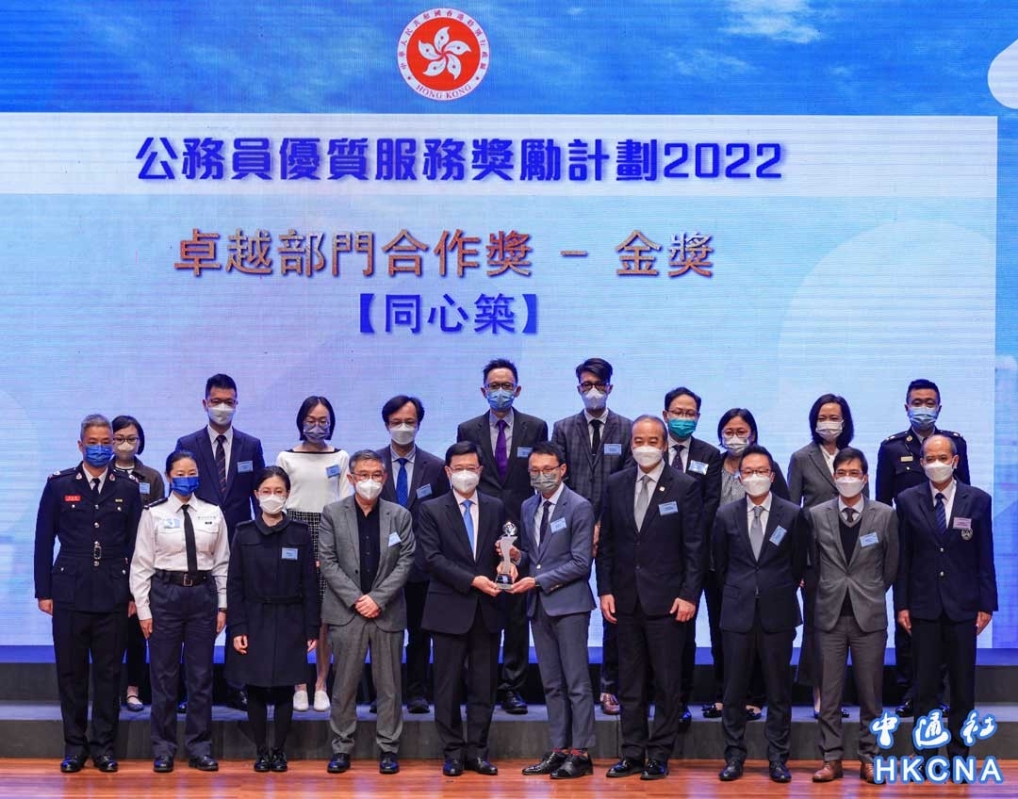 12月12日,香港舉行2022年公務員優質服務獎勵計劃頒獎典禮。圖為香港特區行政長官李家超(前排左五)頒發卓越部門合作獎。(香港中通社記者 許其皓攝)