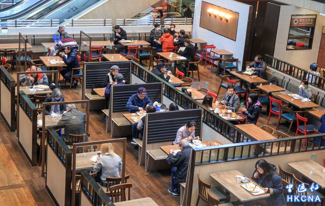 12月14日,香港市民於食肆內用餐。當日起,香港實施防疫措施新安排,市民進入食肆等表列處所毋須掃描 “安心出行”二維碼,取消入境人士“黃碼”安排,但依然保留“疫苗通行證”。(香港中通社記者 許其皓攝)