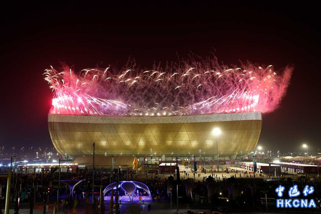 當地時間12月18日,2022年卡塔爾世界盃決賽在卡塔爾盧賽爾體育場進行。最終,阿根廷隊以7:5(點球大戰4:2)擊敗衛冕冠軍法國隊,時隔36年後再次奪得世界盃冠軍,這也是該隊隊史第三次奪冠。圖為頒獎儀式煙花在體育場上空綻放。 香港中通社圖片