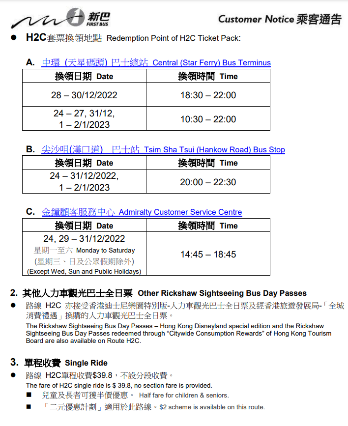 新巴提供。 “H2C”號線於12月24日至2023年1月2日晚上分別由中環(天星碼頭)及尖沙咀(漢口道)開出,中途設有多個上落車站,並途經多個欣賞聖誕燈飾的熱點。當中由中環(天星碼頭)開出的時間分別是晚上7時、晚上8時晚上9時及晚上10時;而由尖沙咀(漢口道)開出的時間為晚上8時半、晚上9時半及晚上10時半。
