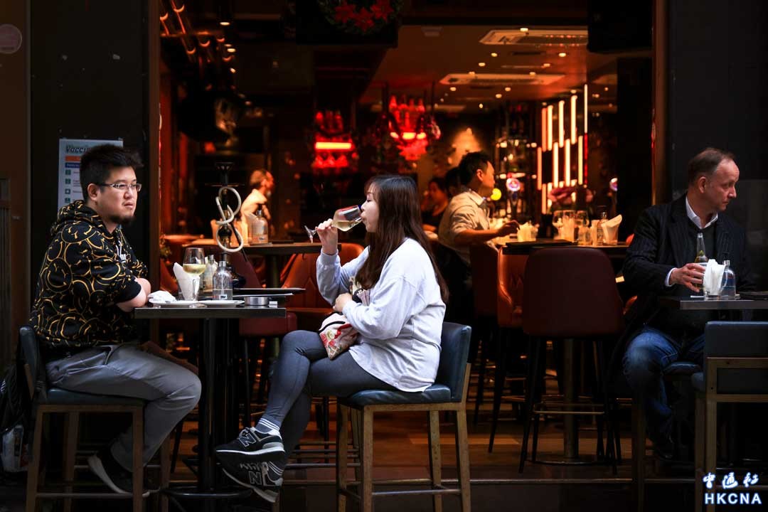 12月20日,香港特區政府公布最新防疫安排,包括撤銷酒吧、夜店、參與宴會人士、參加本地遊旅客的快速抗原測試要求。圖為市民於酒吧休閒。(香港中通社記者 許其皓攝)