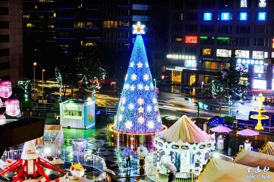 台灣“2022繽紛耶誕玩台北”以全新概念燈光為設計,推出奇幻夢境、璀璨希望、閃耀星河、浪漫愛情及快樂繽紛等主題燈飾,設計多個打卡點,裝點台北東區,讓不少民眾在信義區商區逛街時欣賞到美景。圖為市府轉運站。 香港中通社圖片