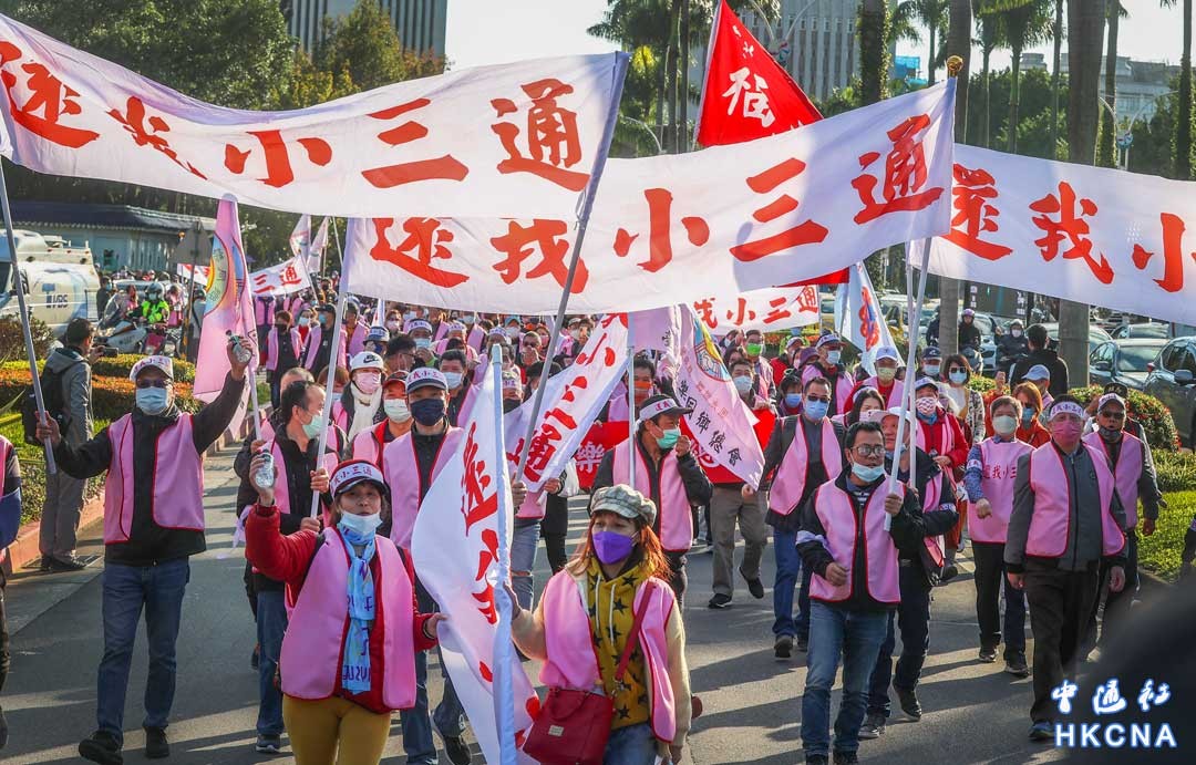 台灣民眾12月24日上台北街頭抗議“小三通”議題,目前因為未開放台商中轉,兩岸直航機票漲到平常的3至4倍。台商與民間團體呼籲台灣徹底取消自身單方面設定的障礙,恢復疫情前兩岸“小三通”的政策。 香港中通社圖片