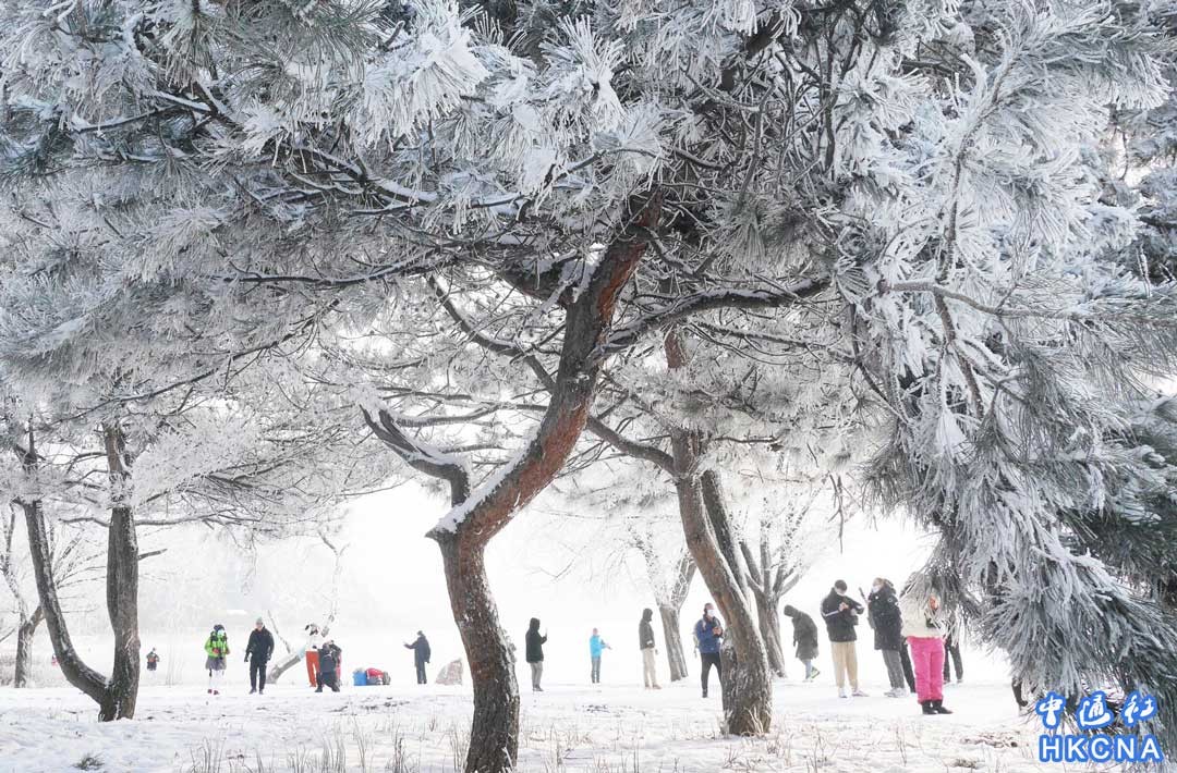 12月24日,吉林省吉林市,遊人觀賞霧凇。當天,吉林市鬆花江沿岸出現霧凇美景。 香港中通社圖片