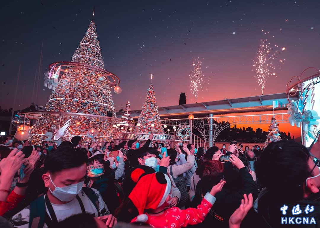 12月24日晚,香港市民歡度平安夜。今年聖誕海港城以“我們的快樂聖誕 Unichristmas”為題,將海運大廈露天廣場打造成“旋轉獨角獸樂園”,讓香港以至世界各地的朋友都能夠一同感受香港聖誕的濃厚節日氣氛。吸引大批市民前來打卡。(香港中通社記者 張海德攝)