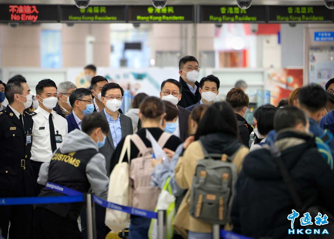 1月8日,香港特區行政長官李家超上午8時半到落馬洲支線管制站視察香港與內地首日免檢疫通關情況。圖為特首李家超與過關市民交流。(香港中通社記者 曹文毓攝)
