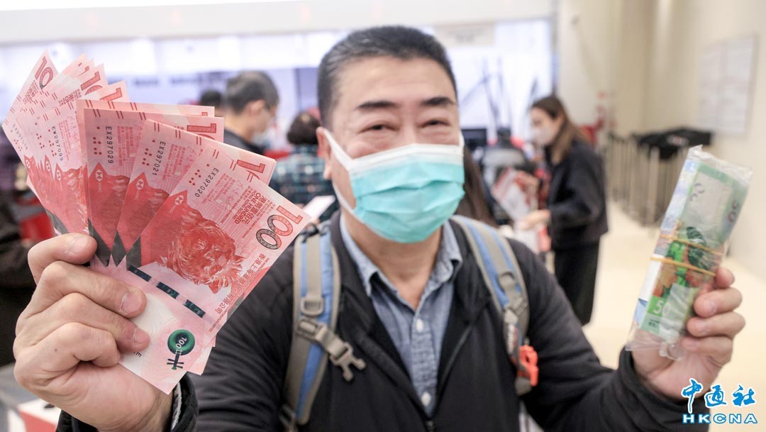 1月5日起,香港多家銀行提供新鈔及“迎新鈔”供市民換領。當日早晨8時許,不少市民前往匯豐銀行旺角分行兌換新鈔,迎接農曆新年。(香港中通社記者 許其皓攝)