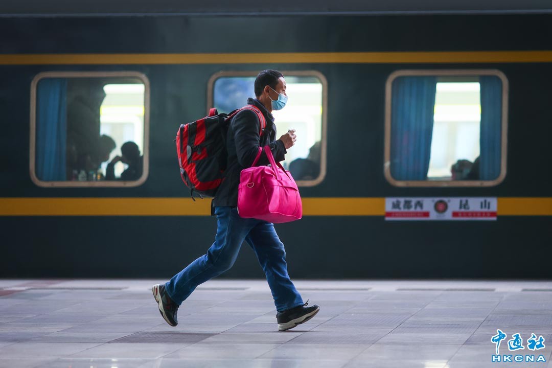 1月6日,江蘇南京,背著行李的旅客在火車站出行。2023年春運從1月7日開始,到2月15日結束,一共40天。據中國交通運輸部初步分析研判,春運期間客流總量約為20.95億人次。 香港中通社圖片