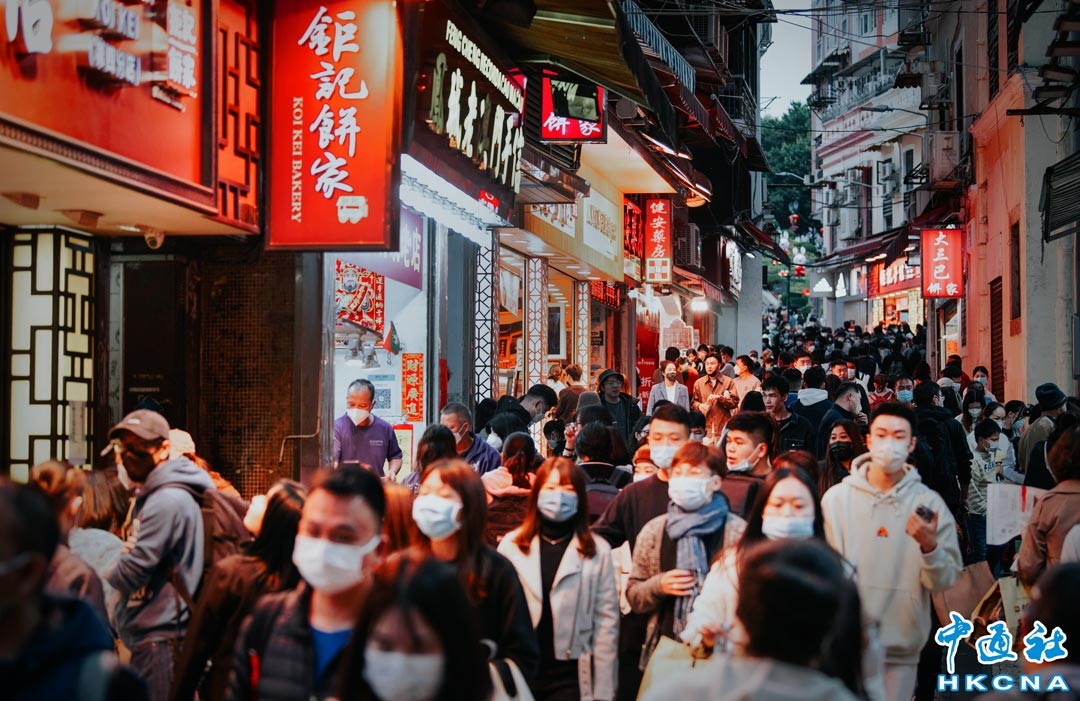 1月8日,旅客在澳門大三巴牌坊手信街。當日,內地及港台入境澳門免核檢,適逢周末,澳門大三巴牌坊和噴水池一帶迎來一波旅客,以往人逼人的場面逐現,附近零售商戶顧客眾多,人氣旺盛。香港中通社圖片