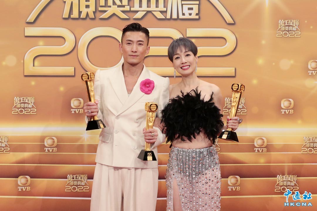 1月8日,香港無綫電視於將軍澳電視城舉行《萬千星輝頒獎典禮2022》。圖為分別奪得最佳男女主角的陳山聰(左)、江美儀。(香港中通社記者 張海德攝)