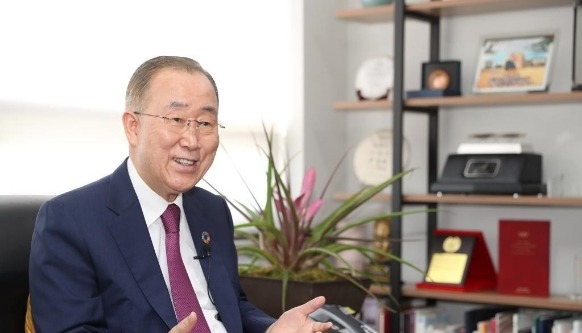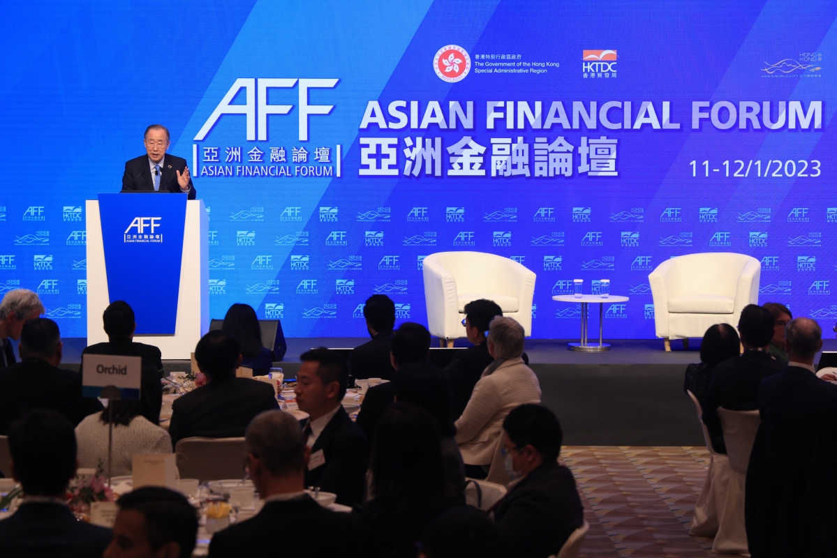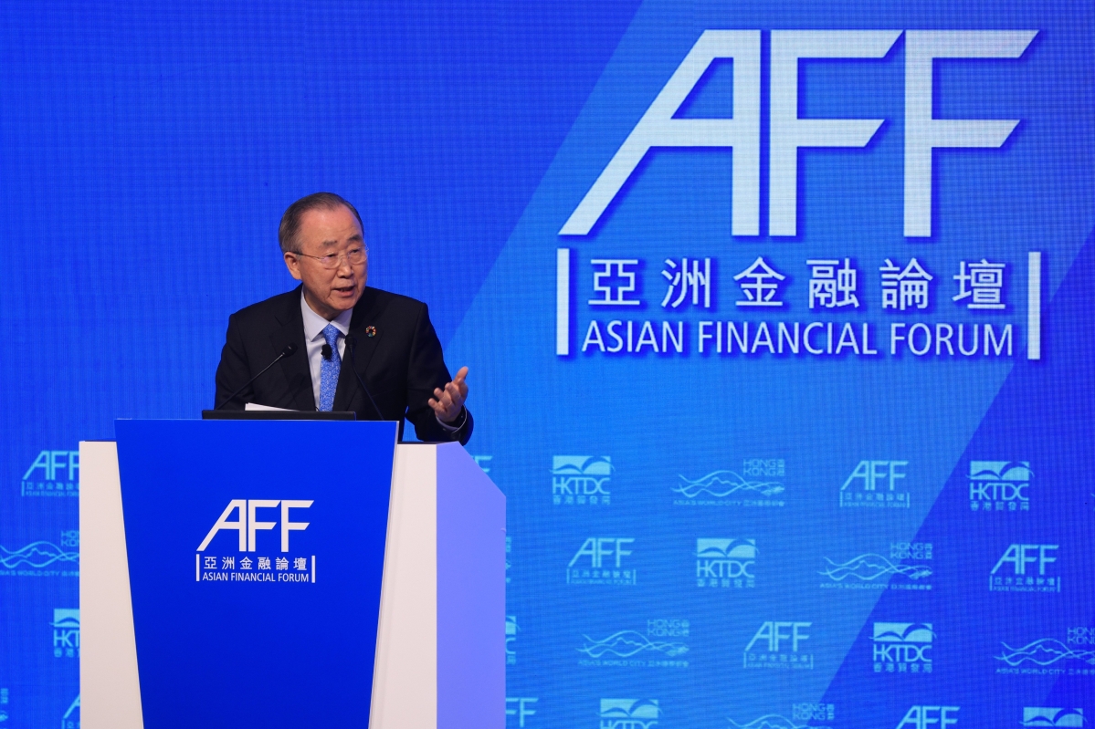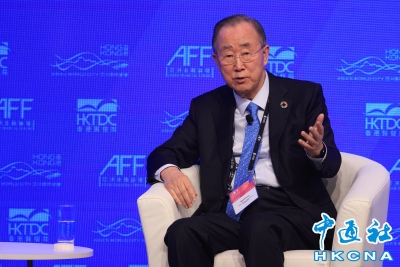 第八任聯合國秘書長潘基文(右)和恆隆地產董事長陳啟宗(左)出席專題午餐會