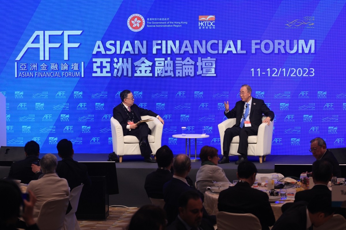 第八任聯合國秘書長潘基文(右)和恆隆地產董事長陳啟宗(左)出席專題午餐會。香港中通社圖片 論壇設有焦點展區,線上線下均可閱覽,包括金融科技專區、InnoVenture專區及全球投資機遇專區,與會者可親身體驗各種新科技。為展示嶄新金融科技,今屆論壇繼續舉辦AFF Deal Flow投資項目對接會,提供平台讓參展商與投資者以一對一會面並進行投資配對,對接會在論壇結束後更將移師線上進行至1月17日,提供更多時間建立聯繫,開拓合作的機會。