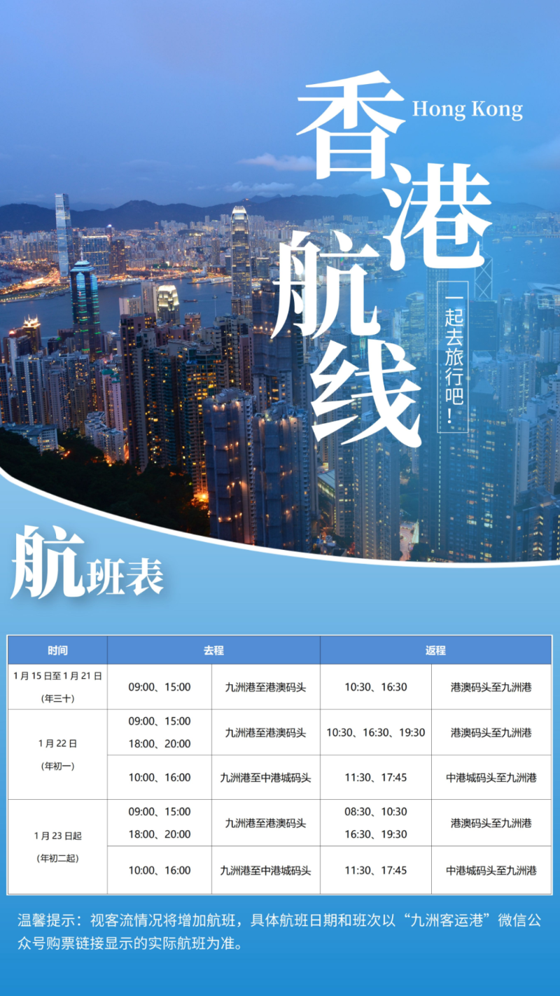 (九洲客運港微信公眾號) 根據目前航班信息,1月15日至1月21日(年三十),珠海九洲港往返至香港港澳碼頭的航班共有4班,1月22日(年初一)九洲港往返至港澳碼頭的航班增加至7個航班,同時,當天還增設珠海九洲港往返至香港中港城碼頭的4個航班。 1月23日起,九洲港往返至港澳碼頭的航班增至每天8個班次,九洲港往返至中港城碼頭每日4個航班。(完) 【編輯:刘春】