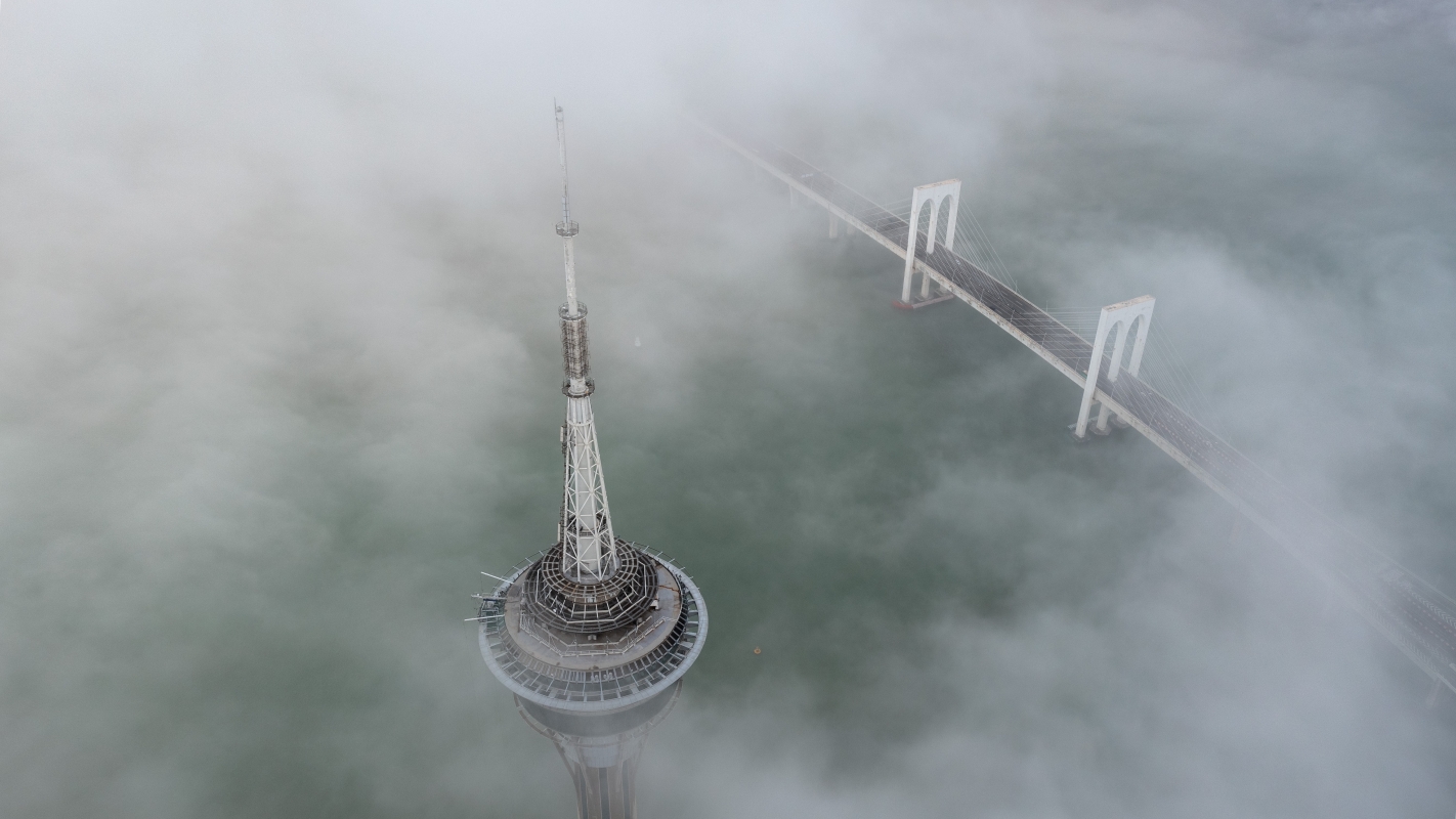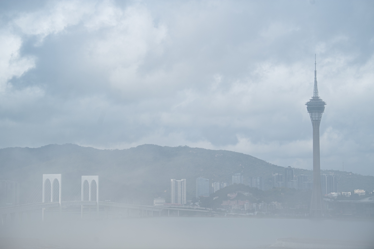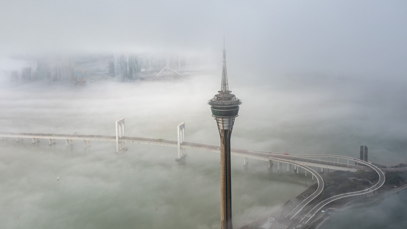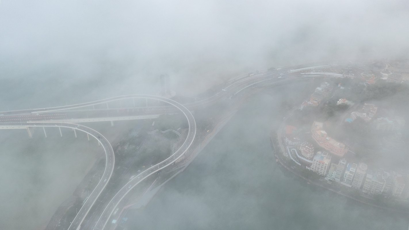 澳門14日晨霧繚繞。海域及上空現濃霧