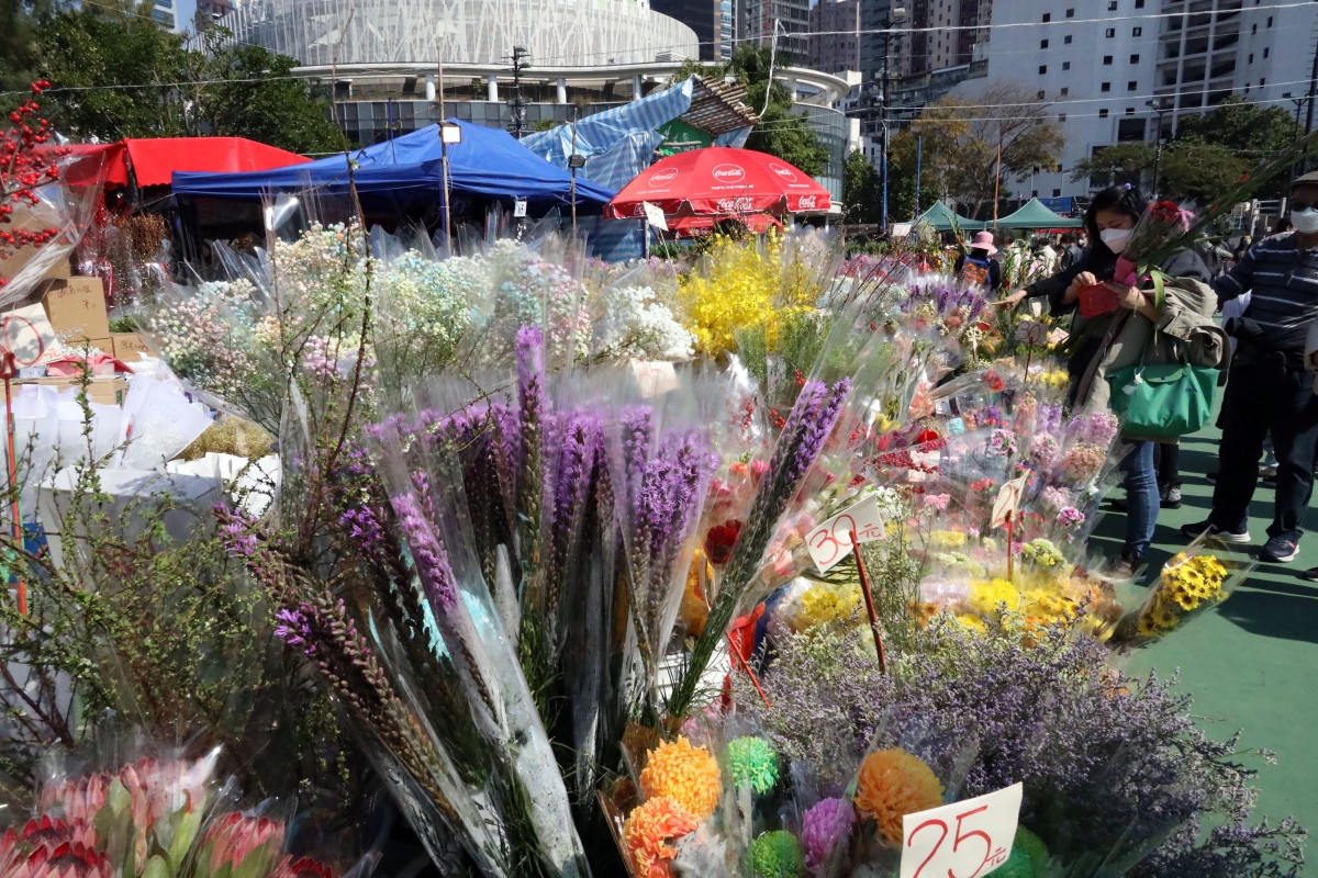 香港天氣晴朗市民到銅鑼灣維園年宵市場選購鮮花歡度農曆新年