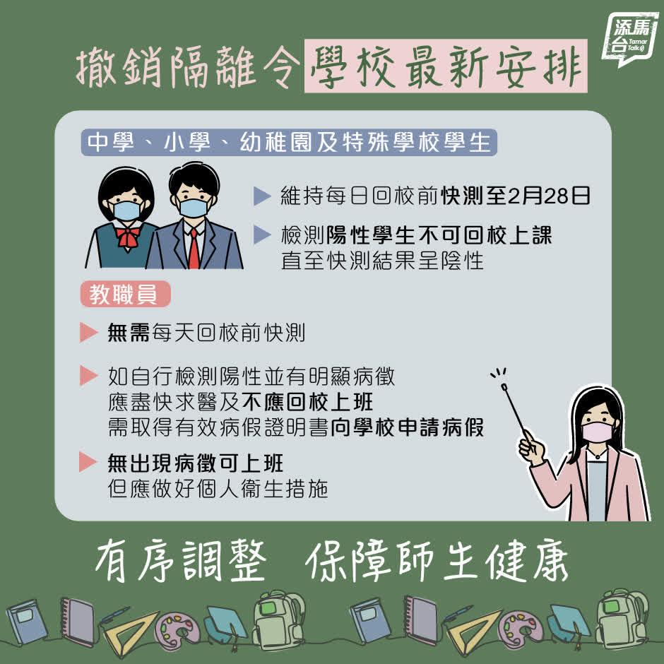 香港新聞網1月28日電 下周一(1月30日)起香港將撤銷新冠確診者隔離令,政府表示,學生是重點保護群組之一,因此維持學生每日回校前快測要求,包括中學、小學、特殊學校及幼稚園,暫至2月28日。