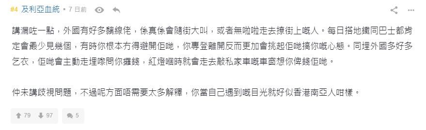 該連登仔開篇就表示,自己認識不少香港移民人士,聽過許多移民故事,他們都認為移民後的生活跟香港有很大的區別。緊接著他就列舉了五項移民之後最不方便的地方: 一、交通不方便:國外地廣人稀,去哪里都要開車,特別是美國和加拿大,鐵路和公共交通不全面,鐵路非常殘舊,不僅不舒服,還經常壞車故障,在鐵路行駛途中還沒有網絡,只能睡覺或者打電話。 二、國外物價貴:不出國不知道,香港物價其實“算幾平(算便宜)”。在國外一頓飯沒有100港幣吃不上,吃一頓麥當勞至少80港幣,去超市買瓶汽水20港幣,算下來一個月夥食費要一萬港幣。還要給服務生15-20%的小費,他形容“這種無恥的收費在外國好盛行”。 他還列舉了交通費貴、油費貴,停車費貴、看牙醫貴、電費貴等等,“香港一個月的交通費很難超過1000港幣,但在國外隨時可以花2000港幣”,“國外就算冬天凍到飛起,夏天熱的要命,也會因為電費問題忍著不開暖氣和空調”…… 三、消遣娛樂的地方比香港少:商場少、商品也少,食物種類也沒香港多,也沒有香港的好吃。 四、人容易不開心:國外天氣不好,溫差大,白天短夜晚長,讓人沒有動力去做自己想做的事,長期這樣整個人好壓抑。也不容易結交當地人做朋友,人很孤單。 第五點,也是最痛苦的——吃的方面:在國外,香港餐廳很少,也很貴,一個禮拜可能只有一到兩天有米飯吃。 最後該連登仔總結道,放棄了香港的工作,錢賺的也少了,身邊的家人跟朋友也見不到,娛樂又沒有,試問誰能適應得了呢? 對於他的好心告誡,不少“手足”意猶未盡,紛紛表示“就這幾點嗎?”“不止吧?”然後就自行補充起來: 講漏了一點,外國有很多神經病,會當街大叫;還有很多乞丐,會主動找你要錢;還有歧視問題……