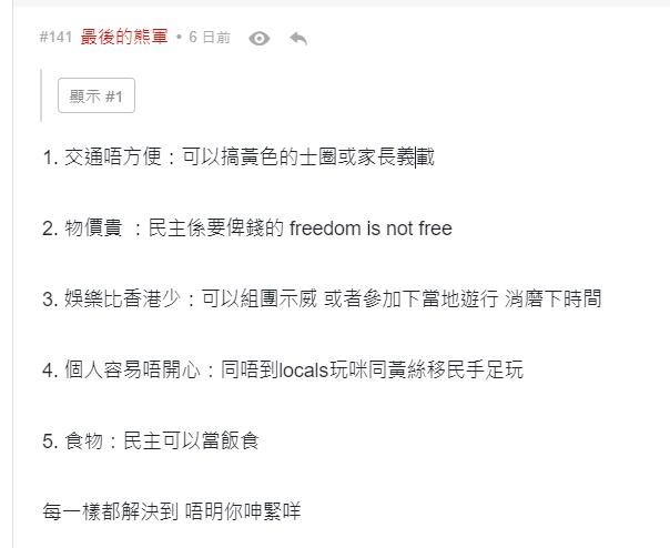 有人對此就表示“支持與肯定”,并提出了“堪稱完美的解決方案”:交通不方便,可以搞黃色的士圈或家長義載;娛樂少,可以組團示威或者參加當地游行;不開心,可以同黃絲移民手足玩;至於食物,民主可以當飯吃……