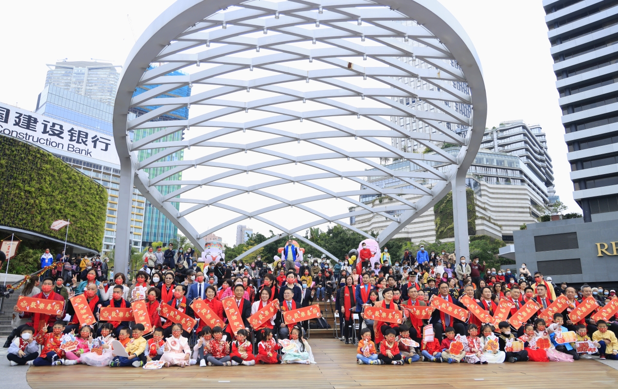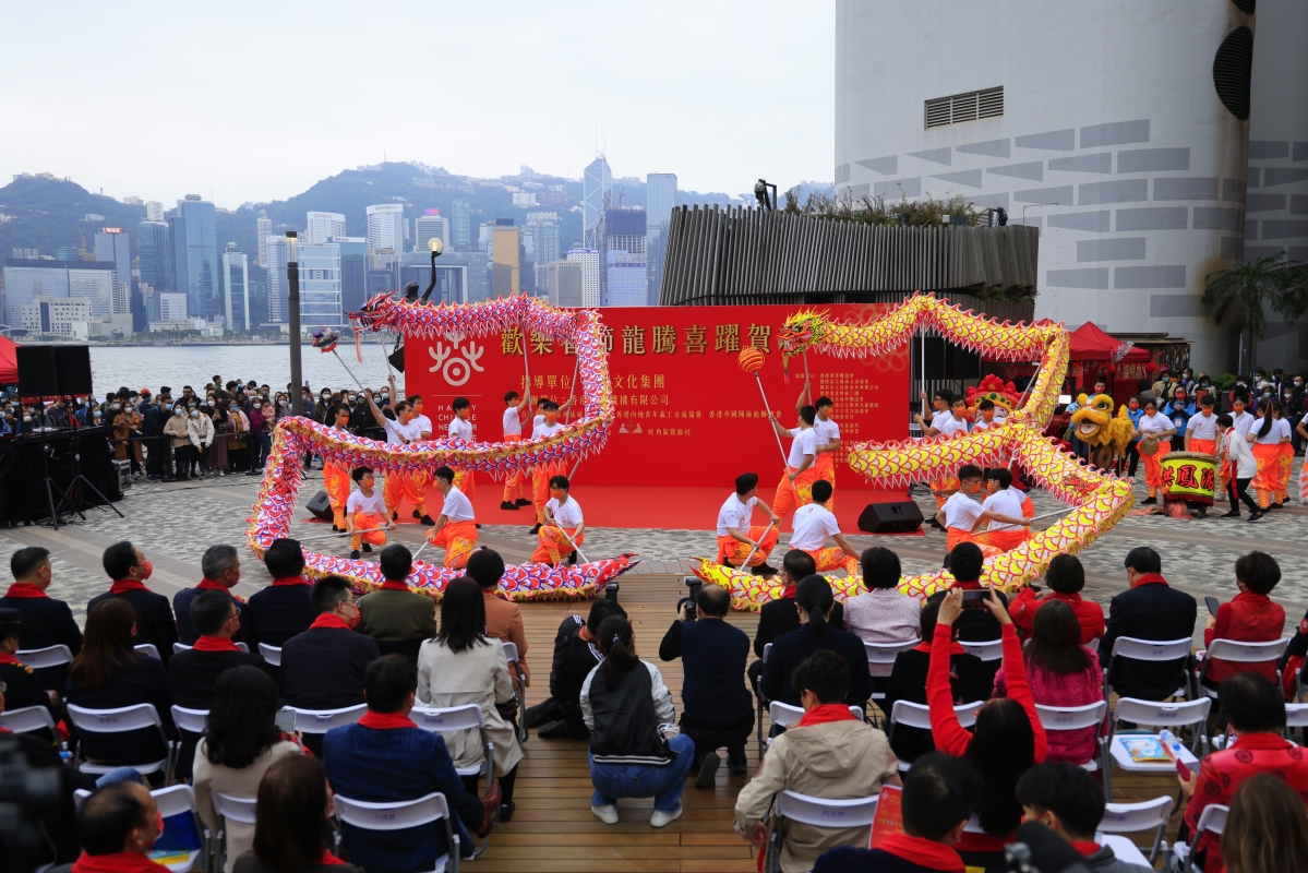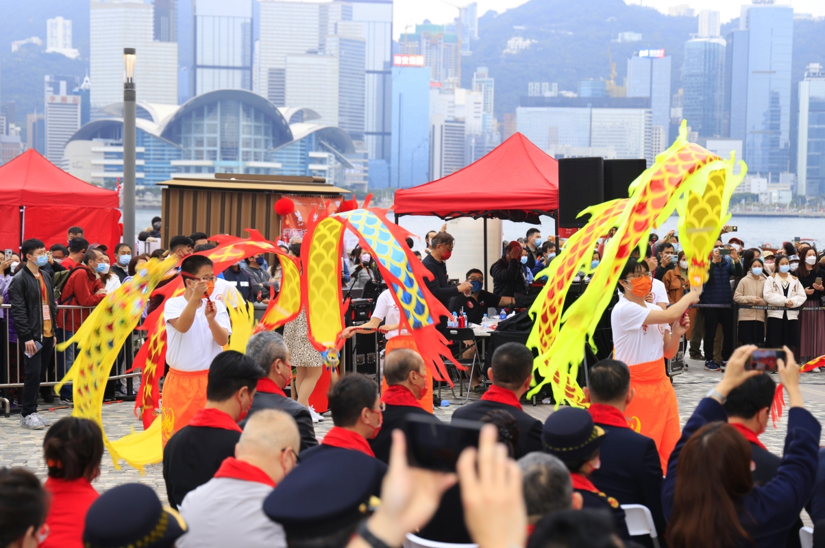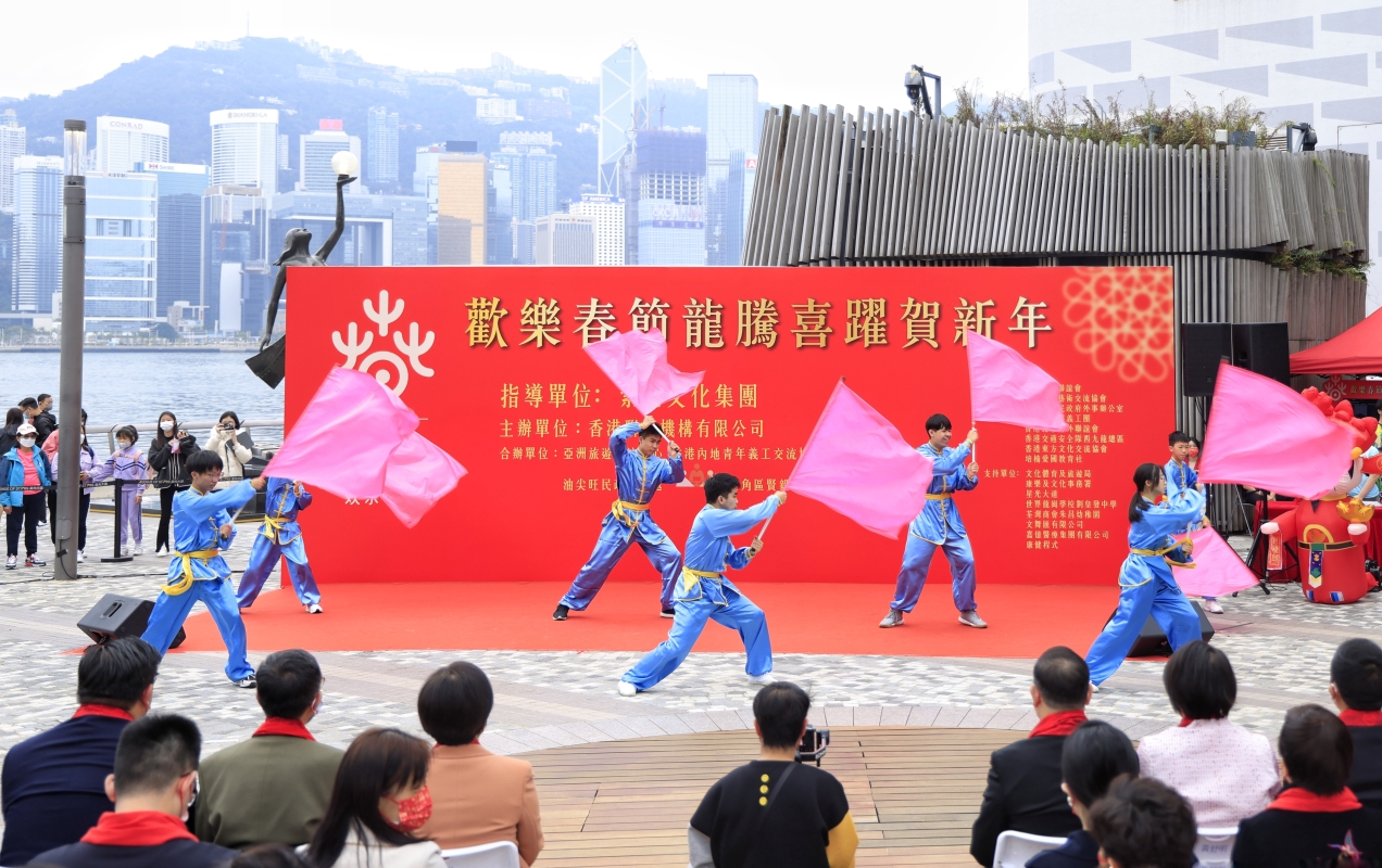 香港新聞網2月5日電(記者 曹文毓) 2月5日,香港尖沙咀海濱舉行“歡樂春節——龍騰喜悅賀新年”活動,與香港市民共慶新春及元宵佳節,現場呈獻青少年國術龍獅表演、青少年集體旗操武術匯演等表演,氣氛熱鬧非凡。