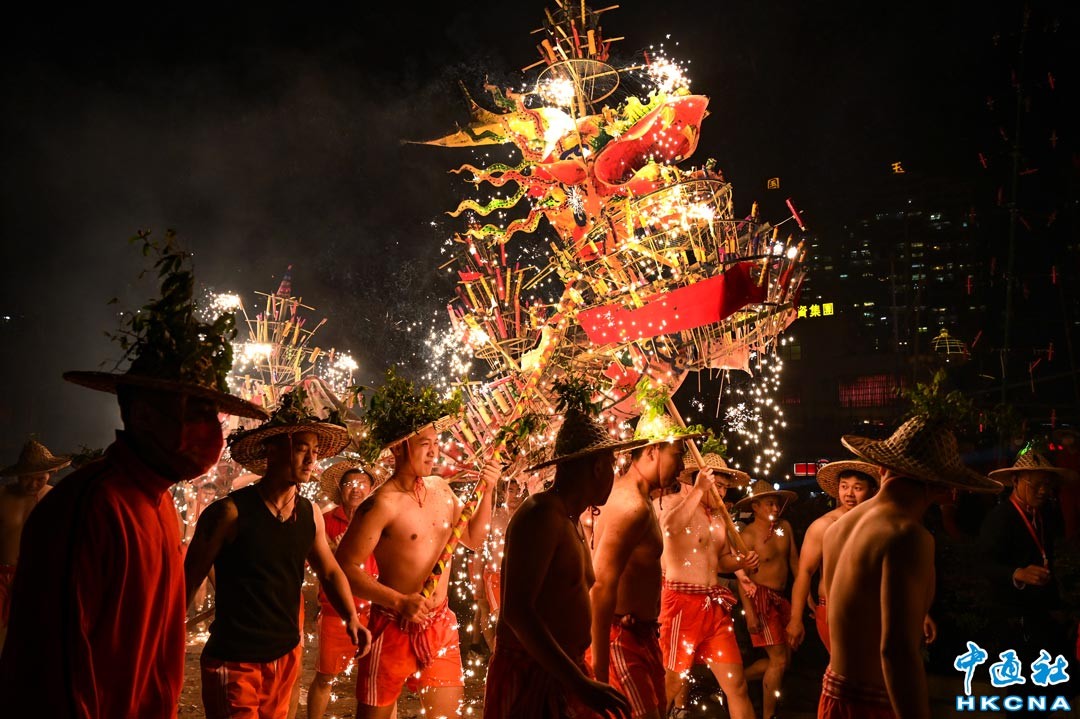 1月31日晚,國家級非遺項目揭陽喬林煙花火龍表演在廣東省揭陽市磐東街道喬南、喬東、喬西各村亮相,祥龍、彩鳳、鯉魚輪番登場,展現非遺民俗魅力。 香港中通社圖片