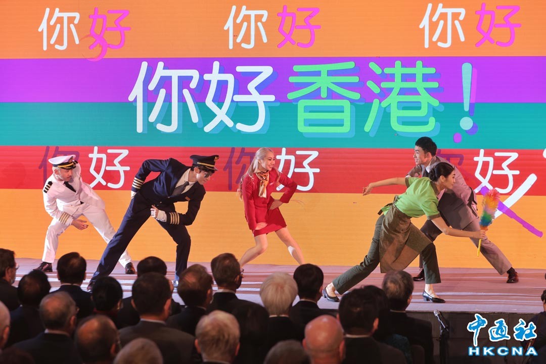 2月2日,“你好,香港!”啟動禮在香港會議展覽中心舉行,為一連串向全世界說好香港故事、推廣香港商機、文化景點及旅客體驗的活動揭開序幕。圖為啟動禮開始時,舞蹈員們以機師、空姐、廚師、侍應等打扮在台上跳舞,呼應“你好,香港!”主題。(香港中通社記者 謝光磊攝)