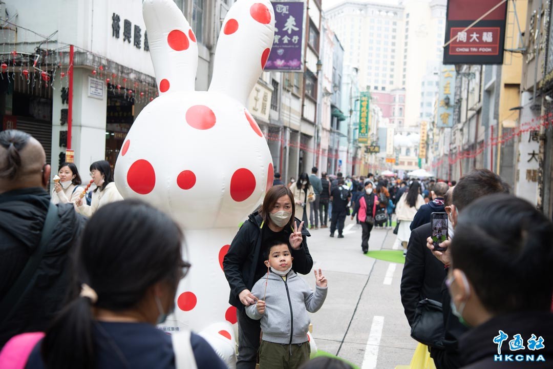 2月4日,市民在澳門新馬路遊覽。當日,“新馬路任我行——步行區試行計劃”。為配合元宵節現場設置了多個花燈,供遊人拍照留影。香港中通社圖片