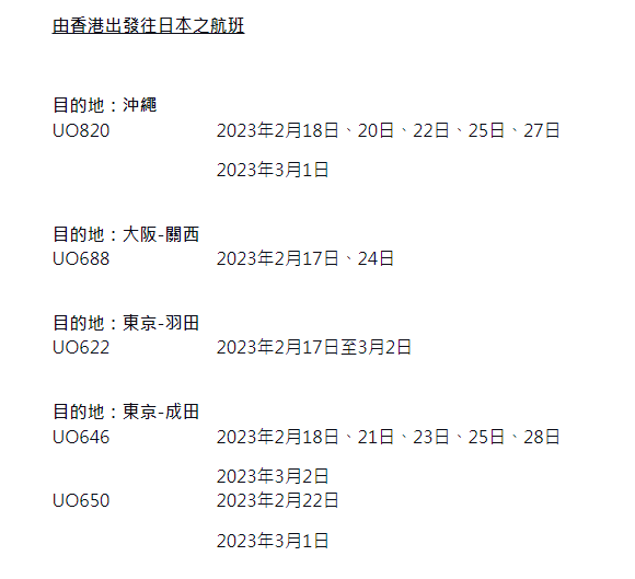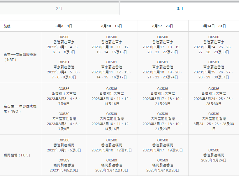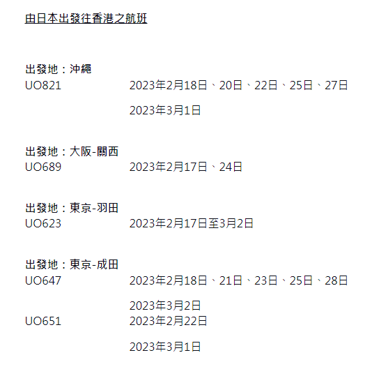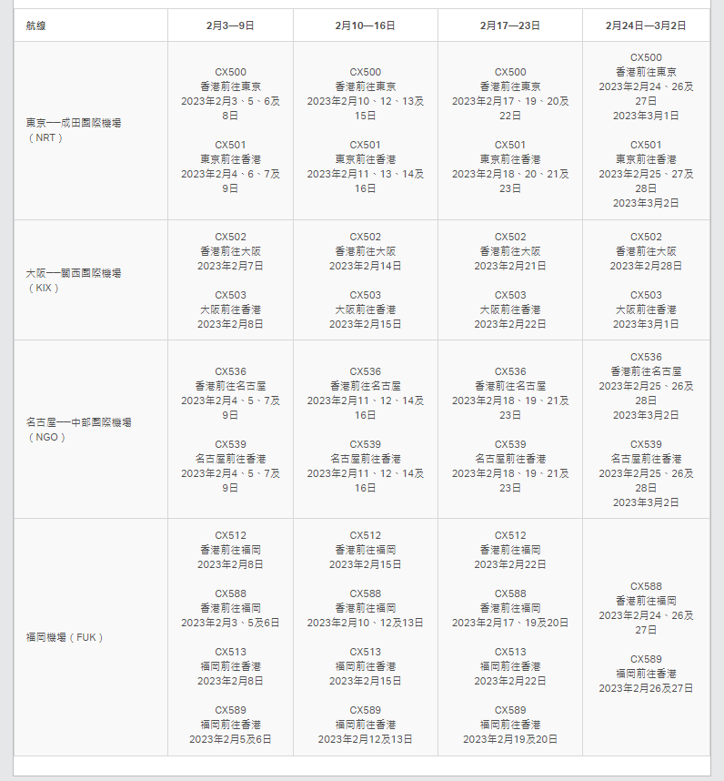 受影響航班。 對於受影響的乘客,發言人表示,會安排原定往來東京、大阪及福岡的顧客乘搭其他航班;而往來名古屋的顧客將會改為乘搭大阪的航班。另外,往來札幌的航班將如期運作。對於受航班取消影響的顧客深感抱歉。 而香港快運亦表示,HK Express每周只能營運74班航班前往日本,較2023年3月原定計劃營運的每周航班少20至22班,為遵守該限制,除早前已取消的航班外,必須取消部分由3月3日至30日往返香港及日本的航班,包括日本出發回程的航班。