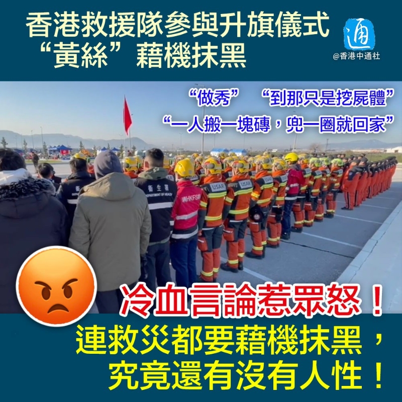 香港救援隊在土耳其與國家救援隊會合,參與升旗儀式(視頻截圖) 在香港連登討論區,有“黃絲”立即抓住“升旗”一事大做文章,稱特區救援隊參與升旗是做“政治秀”,繼而開始冷嘲熱諷,聲稱“香港救援隊沒有地震救災經驗”、“到那只是挖屍體”,“一人搬一塊磚,兜一圈就能回家”等,言論冷血程度令人咋舌。 還有“黃絲”“天真”發問,“為什麼穿著制服登機”,“全副武裝帶著工具也能登機嗎”,話裡話外仍在暗指救援隊作秀。 然而“黃絲”的盲反只會暴露自己的無知,惹來一眾網友批駁! 對於特區救援隊參與升旗一事,有網友貼上日本救援隊身穿制服、舉著旗幟的照片,質問“黃絲”:“日本也升旗,怎麼沒見你們發話?”